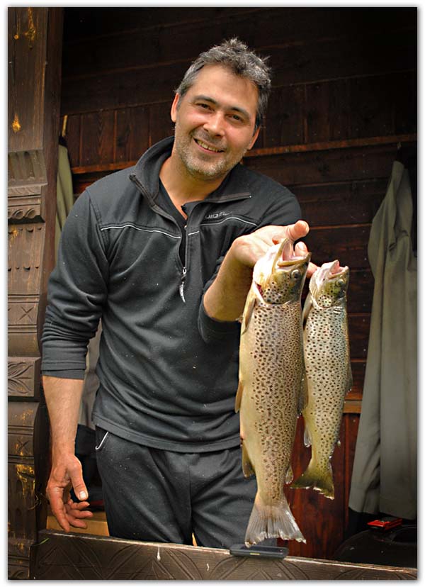 Carlos slet også denne uken, men plutselig en og samme dag var det han som stakk av med loddet. Selvsagt hadde Ragnar spottet den “minste” fisken og ba Carlos om å “ta´n”! Carlos som også er en dyktig fluefisker gjorde som den eldre herre sa, og kroket hans første ørret for denne tur, for småfisk tells jo ikke! Litt senere tikket det inn en sms der Carlos hadde fått én litt større ørret. Ikke så mye, men litt større. Jeg velger å si det som det var, at Ragnar og Carlos er veldig uenige om hvem som fikk den største fiske i elven…..så dette vil trolig være et tema et annet år også. (Sannheten var at Carlos avlivet den største som veide 1,135 kg.)