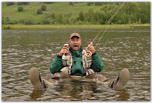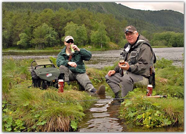 Ettersom det var lite insekter og klekking ble det jo alltid litt tid til å kose seg innimellom øktene. Trond og Ragnar under seg en lite skvett som også ble slått på elven som en tradisjon. Tradisjoner er meget viktig for fiskere. Enten man er laksefisker eller man fisker etter ørret. Tror sikkert det er tradisjoner for hvalfangere, men det kan jeg sjekke opp til neste gang. Tradisjoner ja! Undertegnede var en som trolig hadde glemt en av tradisjonene! Med så masse luft i vadebuksen, kunne jeg lett bruke denne som en Bellyboat.