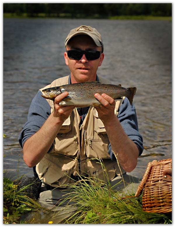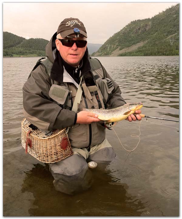 Carlos var den som strakk det lengste strået. I det han skulle trekke tørrfluen inn, dukket den under vannfilmen. Det vil si at han fisket vått! Sånn er det Carlos!! Vel, uansett hvor uflaks man har når fisken biter, var nå dette en større ørret. <<Den er ikke sååå stor>> sa Carlos!