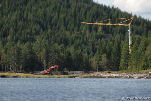 Det er første gang jeg ser en gravemaskin og en byggkran her nede. At dem bygger hytter lengre nede i Langevann er jo rart nok, men at en stor kran står her inne ble merkelig. Passer liksom ikke her. I Oslo er det greit, men ikke her mitt i naturen. Håper dem rydder godt etter arbeidet! Dette sammen med at Treschow høster som det så flott heter, mye av skogen i området, er det fler som føler på som miljøkriminalitet. Dette er jo heldigvis kun for en periode og skogen vil jo gro opp igjen samt at vannene vil ha en mer stabil vannstand, men det føles jo som det meste her oppe blir fiklet med.