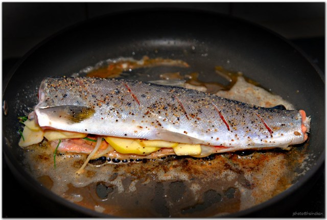 enn fisk. Småsei var også på plakaten denne ettermiddagen, men det var ikke det jeg ville ha! I det mørket la seg over Sandefjord bet det på en prikkefant på 720gr. Grei kondisjon og en ørret som ikke hadde gytt og heller ikke skulle gyte i år. Små lenker av rogn, så denne ble til middag for 2 når jeg kom hjem. Nystekt sjøørret med mandelpotet og Sandefjordsmør! Takk for maten ja……