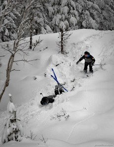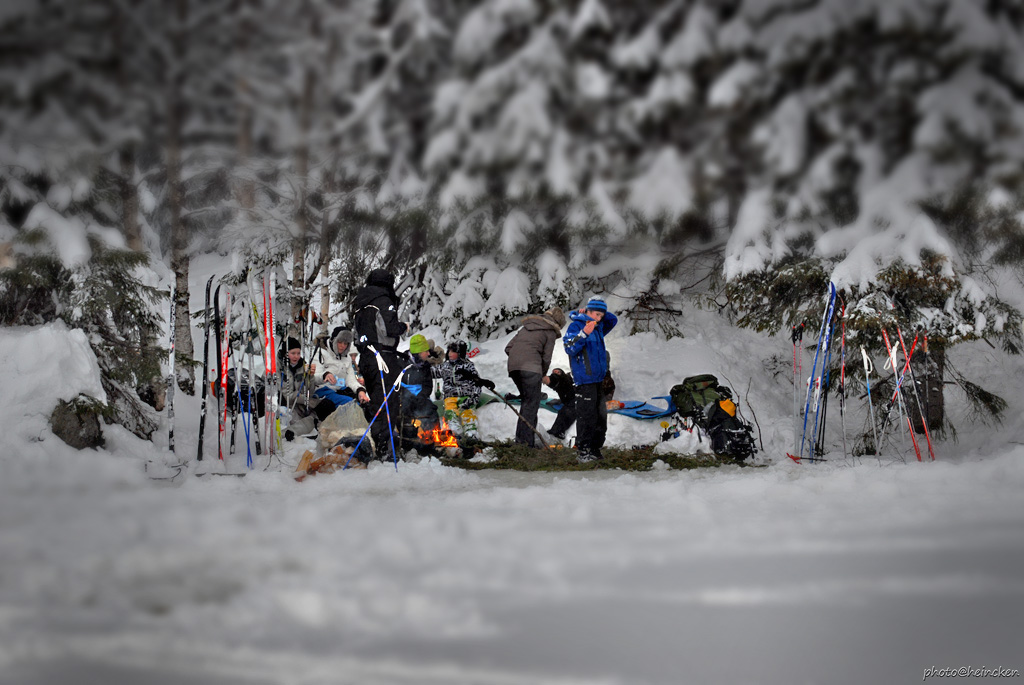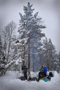 man tråkker mellom snøen ned til lårene hvert eneste skitak man tar. Mye overvann lå under snøen og gjorde ting litt mer utfordrende når vi kom frem til plassen der vi skulle lage bålplass. Ole hadde dratt med seg en pulk full
