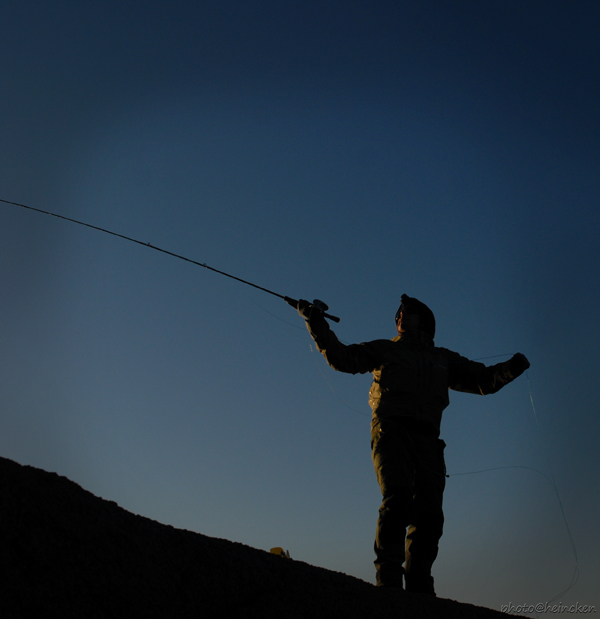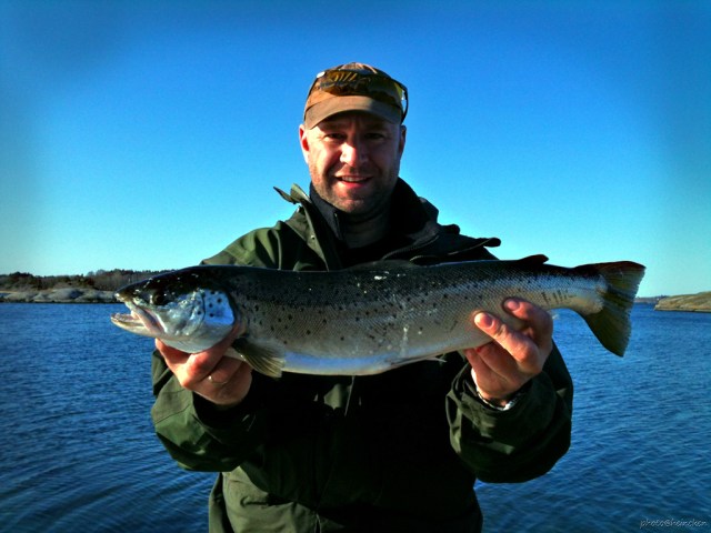 Klokken var 06:45 da den første sjøørreten tok børstemarken og kroket seg godt. 52cm lang og 1,1 kg, noe som var en god matfisk. Det gikk ikke mange minuttene før jeg igjen hadde slag på fluen og denne var større, men den holdt ikke. Det er lenge siden jeg har følt at jeg har vært ute på riktig plass til riktig tid. Nå var solen også kommet opp på himmelen, hvilket varmet litt, for da jeg reiste ut var det kun -2 gr. men vindstille. Da jeg spiste matpakken som min frokost, så jeg