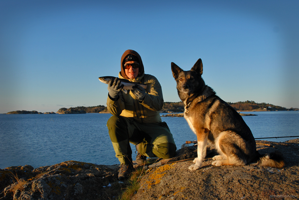 Sjøørreten til Tom veide 735hg med god kondisjon. Tinka var også med, men denne turen gikk det bra med alle pinnene som lå langs vannet! Ellers pleier hun å være litt i overkant ivrig etter pinner, blåskjell, steiner mm. En fin tispe som stort sett er med på de turene Tom drar på, hvilket gjør henne til en god turveninne for Tom. Forutenom denne sjøørreten som Tom lett poserte med, fikk han totalt 5 sjøørret hvorav 2 ble med hjem som matfisk.