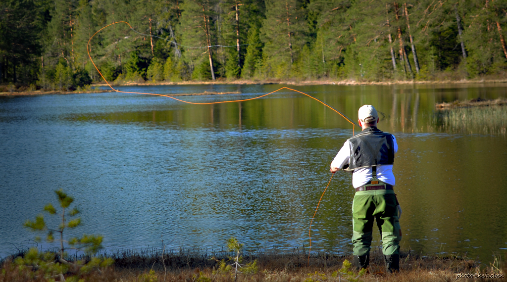 Årets første tur ut i skogen med tørrflue! Jaggu deiligt å kunne komme seg avgårde etter jobb når gradestokken viser 21 grader så tidlig på året. Ragnar og Tom skulle også komme, men var noe senere enn meg, så jeg fikk god tid til å se meg godt om. Da jeg kom opp var det mye liv ute på vannet! Det vaket og jeg fikk en smule stress over meg, helt til at jeg fant ut at det ikke var fisk, men frosk.