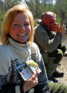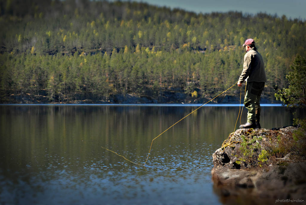Da vi omsider kom frem, dro Laila opp fluestangen sin samt et flueskrin. Tja….hva ska´n si da? Ehhh…..vel, noen må hjelpe noen med å skaffe Laila noen skikkelige fluer! Det hun hadde var stort sett laksefluer og 2 våtfluer. Tom som en dyktig læremester i fluekasting bør nok også påta seg det fulle ansvar for opplæring av fluekasting-og fluebinding!