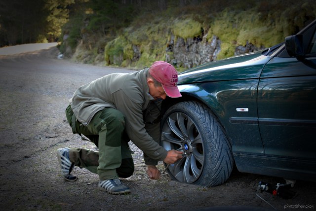 Ut på tur aldri sur……heter det og denne morgenen var det mye som fikk en annen start enn det vi hadde forventet oss da vi satte snuten mot Kanonlivann som ligger i nærheten av Mykle nord for Siljan og sør for Skrimfjellet. Normale privatbiler er ikke egnet for alle slags veier, hvilket nå er bevisst . Smellet hørte vi da vi kjørte på noe og tror garantert at dette skyldes dårlig veihold av stat-og kommune, så noen meter senere ble det stopp for å konstanterer faktumet at det ble dekkskift på bilen!
