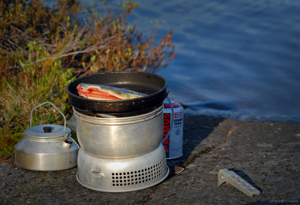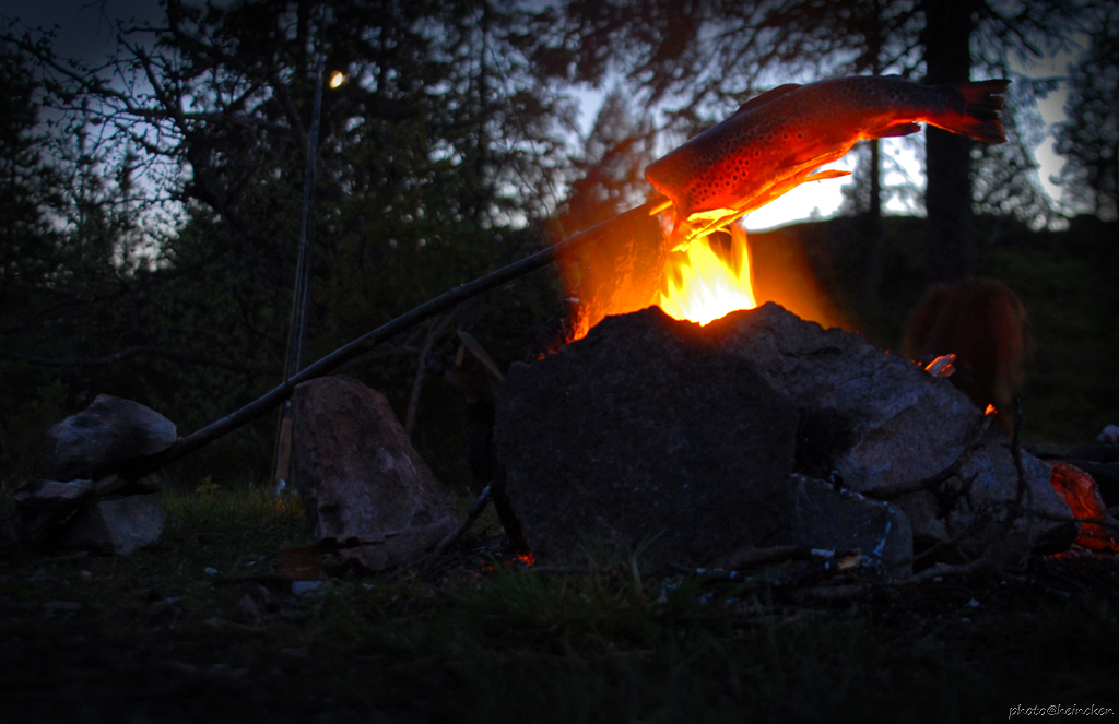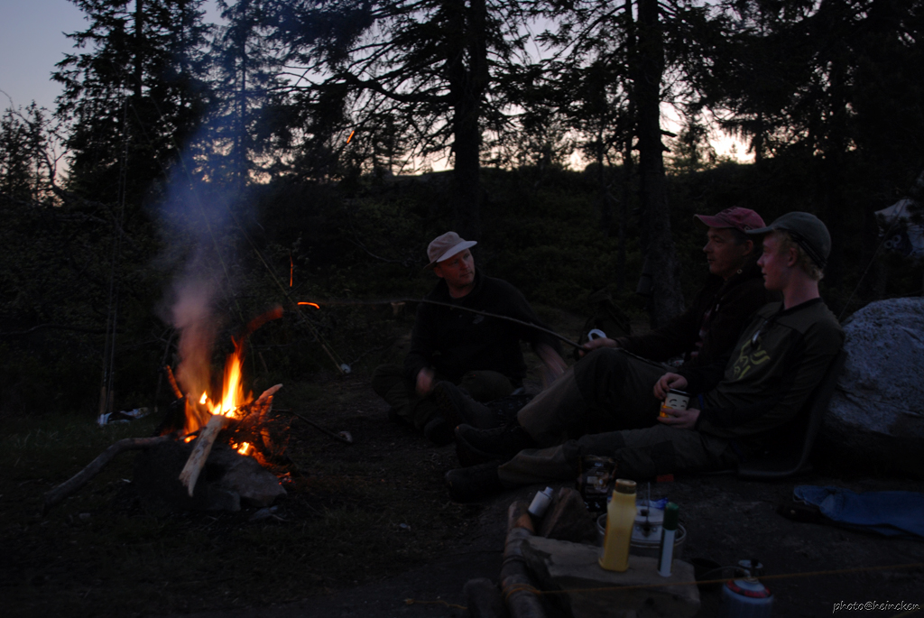 også hadde klekket, men dem så vi heldigvis ikke! Utpå kvelden dukket Leif Erik opp. Han hadde også tatt seg bryderiet og reist den lange veien oppover til Fiskelaus der oppe i nord. Hans frusterasjon var at ølsalget var stengt p.g.a. dagen-før-dagen, altså 1.pinsedag hvilket betyr at NORGE as ikke kan selge øl etter kl 16:00 (God-dag mann økseskaft, for det ville jo vært en synn å drikk øl denne kvelden) Men rutinert som vi fluefiskere er, så hadde vi fordelt det vi hadde, slik at da Leif Erik kom opp, var velkommsten stor og gavemildheten enorm! Øl og mat + en lille, ble tilbydt, men han hadde ikke tid til det, for her gjalt det å fiske mens det ennå var lyst og noen ørreter vaket. Leif Erik fikk også fisker, men ikke så store at han tok dem, så dermed var det muligheter for Tom og Leif Erik å grille seg noen pølser, i tilleg til at ørreten Tom tidligere hadde fått, nå skulle varmrøykes over bålet. Enkelt og fantastisk godt!