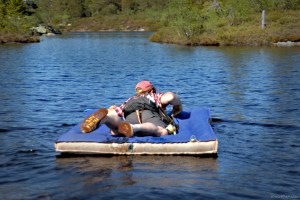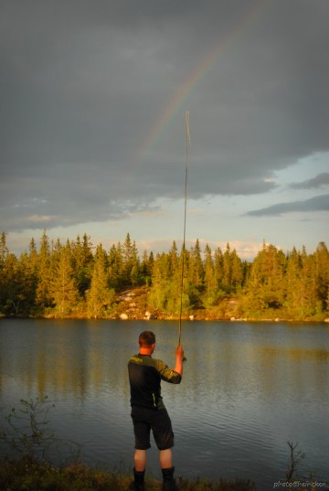 Ikke mye, men nok til at det var regnbue på himmelen og dermed var vi skråsikre på at dette er det regnværet som var i Norge, så da er vi stolte av det! Etter flere timers fiske denne kvelden var det ingen flere fiskehistorier å dele, hvilket resulterte i at vi lagde et lite leirbål som ble godt kontrollert og som lå ytterst på en fjellknaus slik at vi ikke skulle få skylden for en skogbrann i NordNorge. Neste morgen bestemte Tom seg for å leve ut en våt drøm han har hatt i 1 år, nemmelig å sjøsette liggeunderlaget sitt for å kunne komme utpå en av de 1000 øyene der de større ørretne vaker.