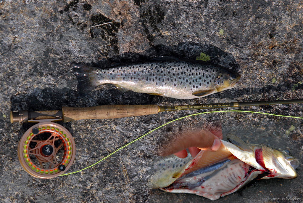 jeg også meg vekk fra stien ditt jeg skulle, så isteden for 30 min. ble turen 45-50 min, men fant heldigvis frem og havnet rett på vannet der vi skulle slå camp. Før Tom og Stein Olaf kom opp hadde jeg noen flott timer med store vakende ørret som beitet på ett-eller-annet, til tross for at temperaturen i vannet var «badetemperatur». Etter å ha vasket av meg den værste svetten fikk jeg landet den første ørreten. Den var ikke stor, men ufattelig fin og feit! Ettersom jeg sleit med å finne ut hva fiskene tok så var det en ting å gjøre, nemmelig å sprette buken og sjekke magesekken. Vi skrev fredag 25 mai, hvilket skulle tilsi at det ikke hadde skjedd så sykt mye, men at ting nok trolig kunne klaffe denne