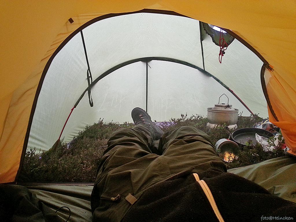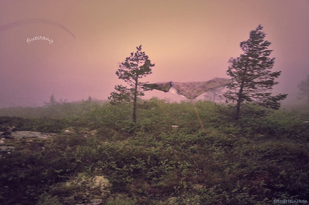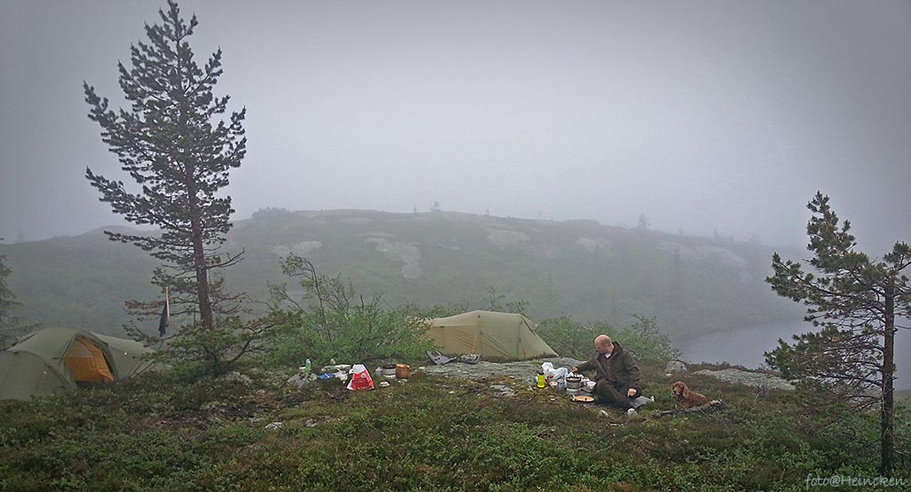 Denne natten var det ekstremvær varsel i Vestfold og Buskerud, hvilket jeg merket på natten! Vi hadde spent opp en Fjellduk mellom noen trær for å ha litt skydd over oss på fredags kveld, men denne ble rene marerittet, for klokken 4 på natten våknet jeg opp til et bråk av dimensjoner og forsto hva som var skjedd utenfor. I stiv kuling, regn og kun iført boxershorts spant jeg ut av soveposen og bort til duken for å redde denne som sto som et seil og blafret så kraftig at det var umulig å klare å sove! Ja, for Leif Erik hadde jo stuffet ørene med «Sov-i-ro», så han skjønte ikke hva jeg snakket om neste morgen om vinde og regn…