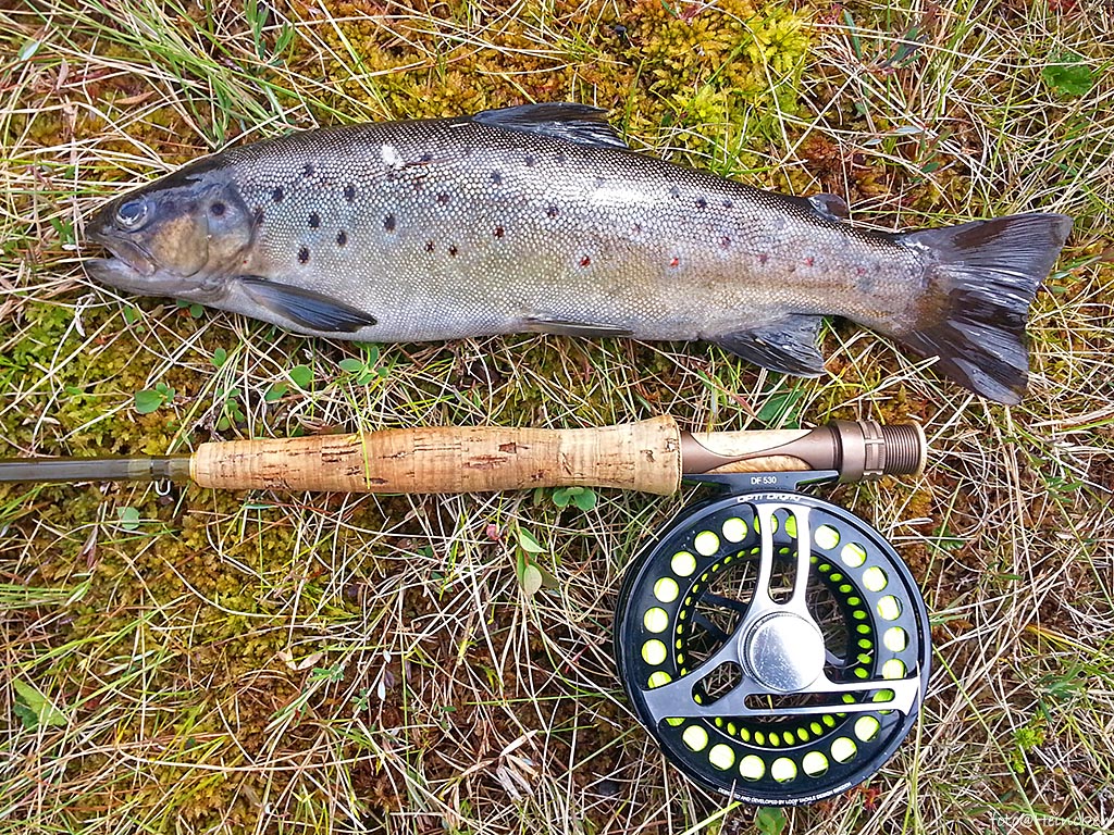 Lørdagen startet med tåke, lik som fredags kveld! Med det lysnet opp og solen tittet frem. Det var duket for fluefiske og vi visste hvilke vann vi ville til først! Leif Erik og Tom har noen historier fra disse vannene som forteller om STORE fisker, og dem så vi denne lørdagen også! Knallfiske fikk vi og vi følte at dette var akkurat det vi hadde ønsket oss til tross for det kraftige været på natten! Totalt fikk vi 13 ørreter denne dagen hvorav den største jeg fikk var 675gr, men de er feite som noen griser! En av ørretene som Larsen fikk hadde en kondisjon på 1,85 som forteller at fisken er rundere enn lang! Det klekket ikke noe veldig spesielt denne dagen, men fisket var fantastisk og vi var kjempeglade over avgjørelsen for å ha trosset været. Det er jo dette som gjør turen skrivbar på en måte 🙂