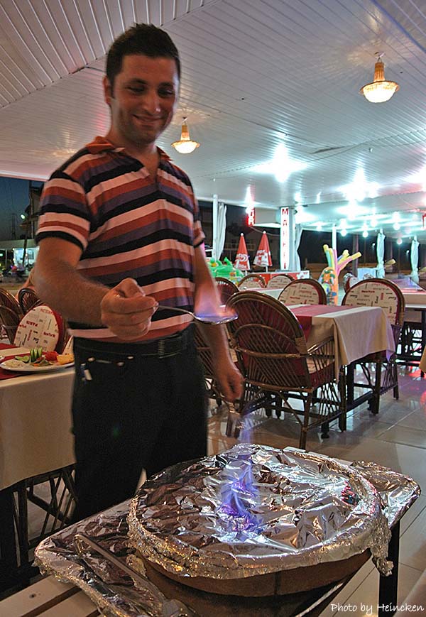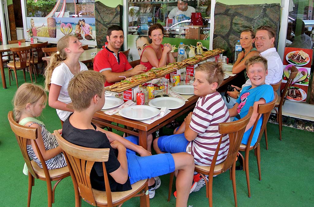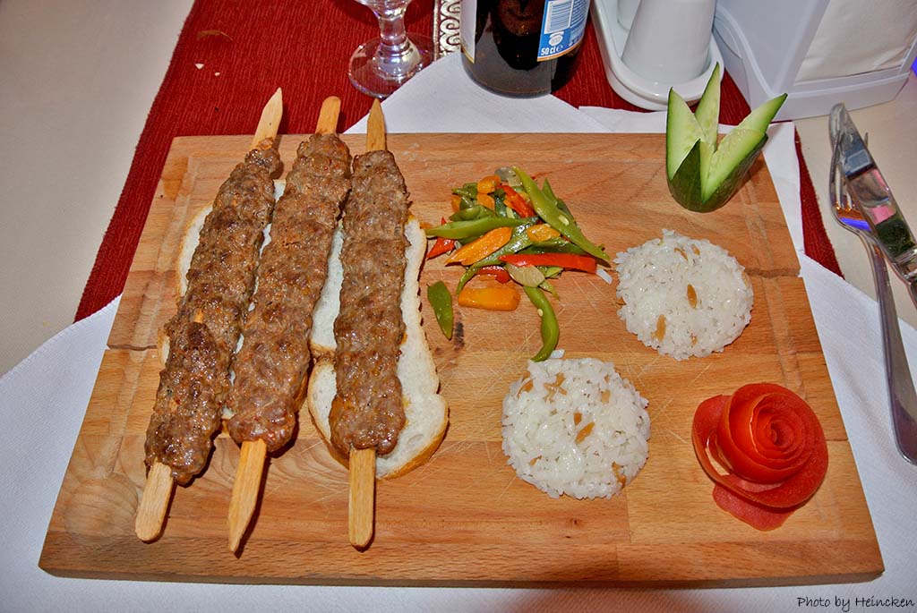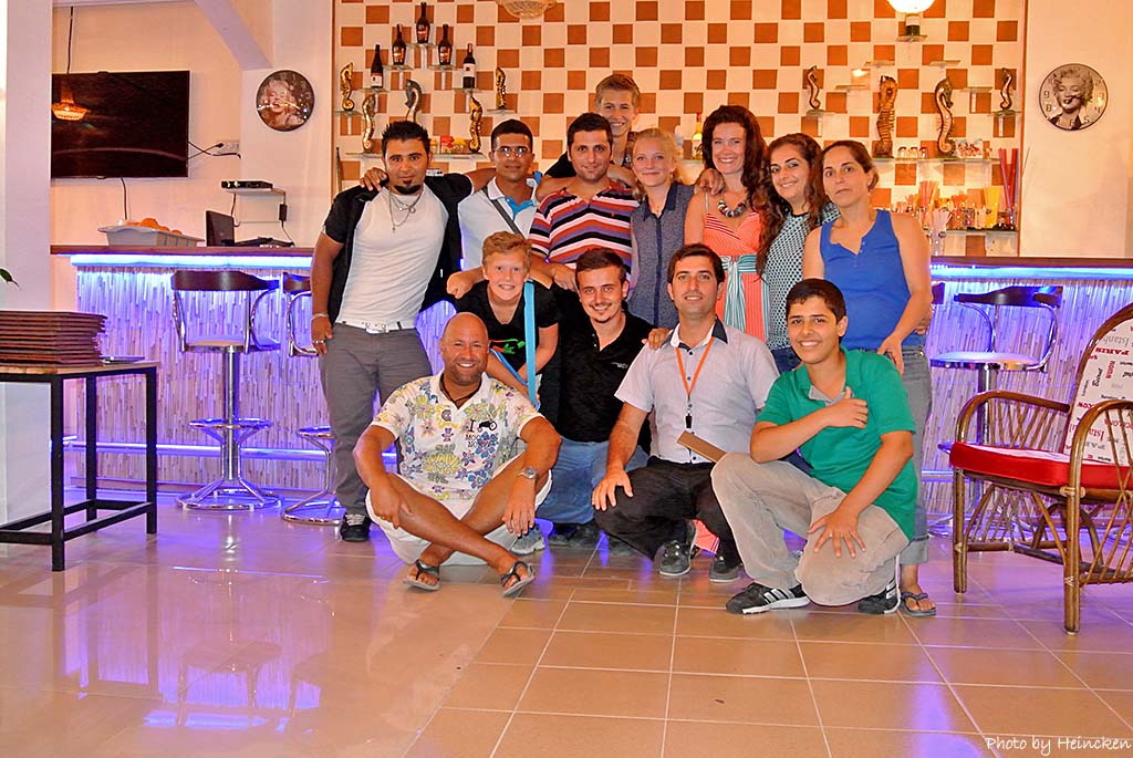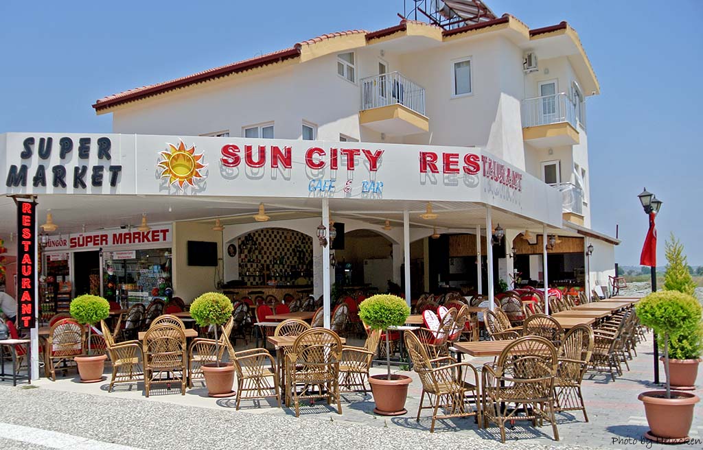 DSC_0120Vi ble godt kjent med tyrkerne som hadde startet opp en restaurant rett ved vårt bosted i Evrenseki. Sun City Restaurant blir drevet av Boran Karacann og Cengiz Atar, og åpnet sommeren 2013. Disse guttene hadde med seg Onur Başçek og Meltem Atar som også lyste opp kveldene med fantastiske gode middager. Maten var typisk tyrkisk og måltidene kostet fra 10-28 TL som er 30-60 NOK, mens en 0,5L. Efes øl kostet 7 TL, ca 21 kr. DSC_0440