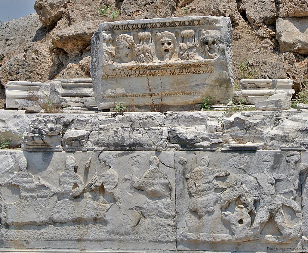 DSC_02527Her ligger bl.a den gamle Pamfylia-teateret som hadde sitteplasser til ca. 20 000 mennesker, bymuren som er ganske slitt og det gamle hospitalet som de største ruinene foruten det velkjente Apollo-tempelet ytterst på halvøyen. Jeg må innrømme at jeg ble litt rørt da jeg kom inn i teateret litt med tanke på hva som historien forteller om hva som alt har foregått i disse arenaene med alt fra kamper til annen underholdning. Det som jeg ble mest imponert av, er at mye av ut-hoggingen i steinene ennå er godt bevart og at man kan se hva det er laget bilder av. DSC_0277DSC_0309Det foregår en restaurering av Apollo-tempelet og derfor var området rundt søylene avsperret. På Today´s Zaman kan man lese om at man skal jobbe for å forhindre at fuktighet og saltvannet tærer på konstruksjonene. Etter flere timer i solen var det på tide å finne godt å drikke, og det tok heller ikke lange tiden før noen av oss hadde fått på seg badetøy for å sette kursen rett i saltvannet mens andre slukket varmen med litt kaldt drikke. Middelhavet her inne hold ca 27 grader og på land var det i solen 59 grader, så den den verste kulden hadde gitt seg kan du si 🙂 En kjempefin video finnes her av området sett ovenfra! Videre i denne gamle delen av Side sto Byzantine Hospital for tur. Her møtte vi en «kar» som pratet i vei på Tysk og skulle ha oss med rundt inne i ruinen. Jeg forsto fort hva han bedrev sin tid med, nemlig å være en privat guide, og det gikk ikke lang tid før han sa: <<Give me some money, please>>. For en tulling, men slik ble det ikke! Det var ufattelig mye å se på og for ikke å snakke om forskjellen på «oss» og dem med tanke på hvilke resurser vi har f.eks av penger. Jeg får litt tanker i hodet når man oppdager at Bensin og Diesel koster det samme som her i Norge, mens lønninger der nede ikke er i nærheten av hva vi har her.DSC_0305