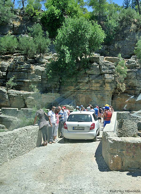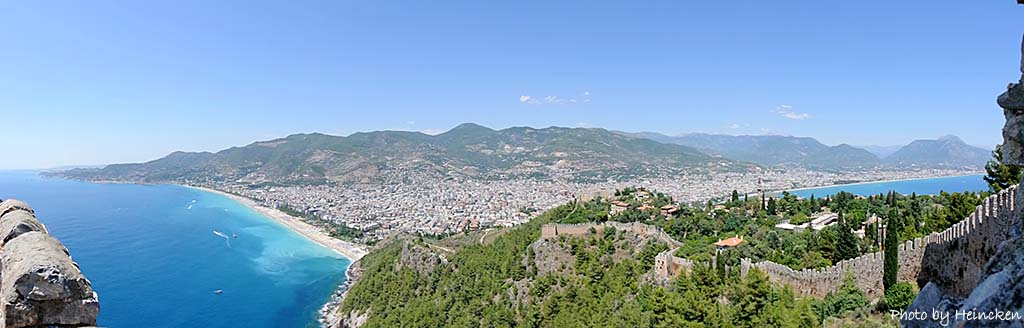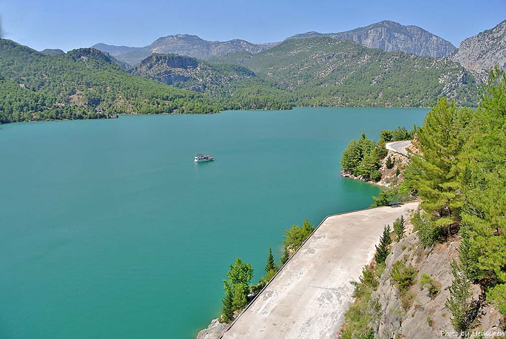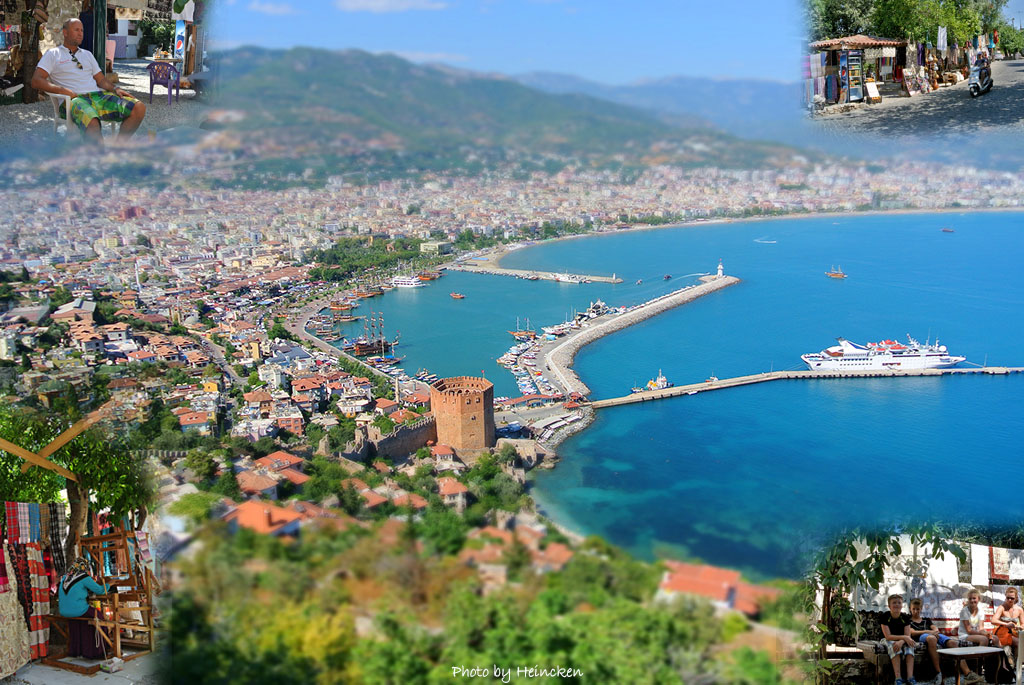 DSC_0522Boran som var sjef for restauranten, ba oss med på tur til Manavgat for å spise en typisk Tyrkisk lunsj, hvilket vi sa ja til. Pide som er tyrkisk pizza fåes i flere varianter, men denne var slik det startet. 6 stk. én-meters lange Pider med tilbehør og drikke ble servert, noe som smakte kjempegodt! Her var alt på Pide´n av grønnsaker og krydder, så noe måtte av Pide´n. Da vi fikk regningen kostet dette 106 TL noe som tilsvarer ca. 300kr for 10 personer inkl drikke og kaffe/te og som Boran fortalte oss, så var dette en pris tyrkerne betaler og ikke en turist! DSC_0548Etter en herlig lunsj, gikk turen opp langs Manavgat River og Green Canyon der det i enden var en enorm demning og sjøen var grønn. Boran ville vise oss en hule som turistene som kom opp, ikke fikk se på deres sightseeing. En lang kanal som gikk skrått opp i fjellet og som endte ut i et stup langt ovenfor det oppdemte vannet The Oymapinar Baraj. En fantastisk utsikt som for noen av oss var ganske skremmende 😉 …og noe som ikke turistene som kommer opp med busser eller harry jeeper med russere får se og oppleve. Her finner du linken til hvor dette er. Boran var en god guide på denne turen, selv om han burde hatt medalje i formel 1-kjøring. Robin og Henriette kjørte sin egen leiebil, hvilket ikke var noe problem. DSC_0572DSC_0575Trafikkbildet i Tyrkia blir man fort kjent med, men da jeg fikk min leiebil noen dager senere, gikk det ca 200 meter før jeg hadde firehjul-skrens på den varme asfalten i en sving, og takk for at bilen til høyre for meg hadde slakket av, så ble det med skrekken og ikke med kræsj! Kjøremønsteret fungerer ved at man legger seg der det er plass og gir bonn gass. Avkjøringene kan fort være på motsatt av det vi er vandt til, så det dukker stadig opp noen «rundkjøringer» der man krysser møtende trafikk på motorveien, men dette fungerer fint bare man følger med! 20130723_111158Alanya ble også et mål denne ferien ettersom vi hadde leiebiler, og med bilen trygt parkert i et parkeringsanlegg gikk turen til en av Alanya´s dryppsteinshuler Damlataş Cave. Damlataşgrotten ble oppdaget i 1948 ved en tilfeldighet under utbyggingen av havnen. Den ligger ved den vestre foten av halvøya. DSC_0703Det er en 50 m passasje ved inngangen. Etter denne passasjen kommer i en sylinderformet hulrom. Dette fører til kjelleren av hulen. Dryppsteinene og stalagmitter inne i grotten ble dannet i 15 tusen år. Foruten sin fascinerende skjønnhet hulen er kjent med sitt luft som er gunstig for astmatikere. Etter rykter om at astmatiske å puste inn luften i grotten, analyserte forskerne en prøve av luften for å bekrefte det faktum at luften var faktisk gunstig for pasienter med ikke-allergisk asthme. De fant ut at luften i grotten inneholdt 10 til 12 ganger mer karbondioksid enn vanlig luft og luftfuktighet på 95%. Temperaturen i hulen er 22 grader celsius. Etter å ha kjølet oss ned for så å bli kliss våte av svette p.g.a. luftfuktigheten, gikk turen opp på toppen av det samme fjellet som stikker ut i havet ved siden av den velkjente Cleopatrastranden, der borgen i Alanya,  Kalesi ligger. DSC_0747DSC_0764Vi tok taxi opp til toppen som ligger 250 moh og har en 6 km lang bymur rundt med ca 140 utkikkstårn. Her inne besøkte vi det stedet på borgen, hvor mange innsatte fra borgens fangehuller møtte sin skjebne. Når plassen i fangehullene ble for trang, ble de av fangene som hadde oppholdt seg lengst i fangehullet, stuet sammen på et lite platå ute ved borgkanten. En etter én skubbet fangene hverandre ut over kanten, inntil det til slutt kun var én igjen. Han fikk så tre forsøk på å kaste en stein ut over kanten og direkte ned i vannet. Mislyktes han, ble også han skubbet ut over kanten, – med den visse død til følge. Etter å ha vandret rundt i noen timer her oppe hvor man har verdens beste utsikt DSC_0797mens solen nådeløst svir av hver eneste flekk på kroppen som ikke er smurt med solkrem, gikk turen til fots nedover veien mot byen. Her dukket det opp motiver og en-og-annen liten bakgård var gjort om til en pust-i-bakken-plass hvor man fikk kjøpt noe å drikke eller andre suvenir.