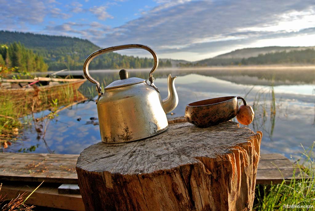 Jeg hadde avtalt med Ole at vi skulle være igang 07:00, så jeg fikk med meg soloppgangen over Breivann med tåkedamp som steg opp fra vannet. Dette er en av de få fordelene det finnes ved å våkne tidlig og kunne klare å komme seg ut av soveposen, nemlig naturen! Vannet ligger blikk stille, solen varmer opp alt i sin vei fra den dukker over fjelltoppene og skrik fra en ørn litt i det fjerne var ting som beskriver en perfekt morgen i naturen. Ny-kokt kaffe er vel heller ingen hemmelighet for de å gjøre morgenen komplett og selvsagt hadde jeg ventet så lenge med denne til at det var fersk kaffe for min roer Ole.