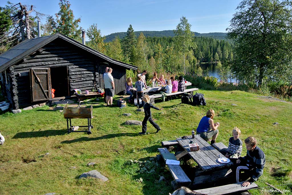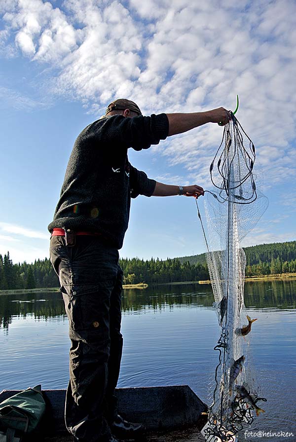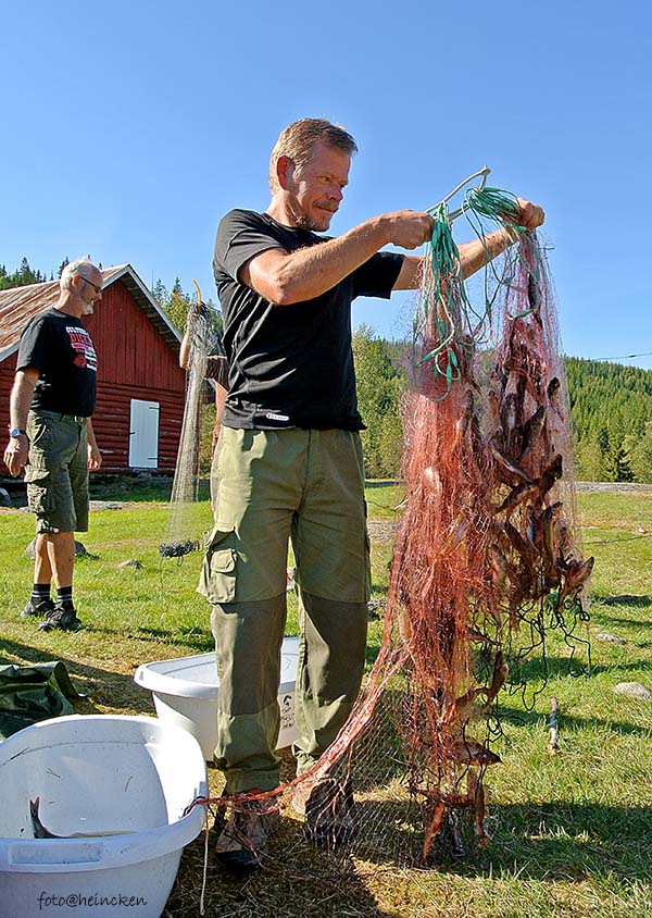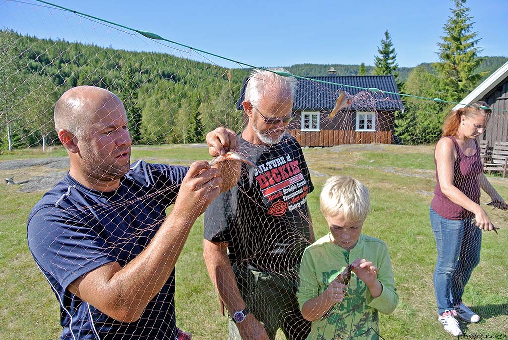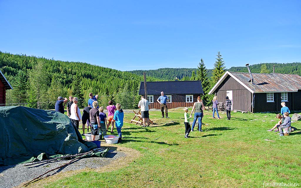 Det er nest siste helg i August og sommeren er på hell, men værgudene har vært «for» snille med oss, for det er meldt blå himmel og sol. Prøvefiske med garn går ut på å få mest mulig fisk i garnene slik at man kan gjøre et gjennomsnitt av hvordan fiskebestanden er i vannene. At det er vindstille og neste fullmåne gjør det vanskelig å fiske med garn. ettersom fisken ser garnet i månelyset! Ruskevær ville gitt optimale forhold, men på en annen side var det duket for en kjempe helg på setervollen med store og små som var kjempespent på hva som dukket opp lørdags og søndags morgen! Ettersom det var mange om beinet, så bestemte vi oss for å ta helgen sammen med ungdommene i Combicamp´n og fant en fin plass for denne litt unna setervollen, slik at vi følte oss litt på tur også når man allikevel hadde satt av denne helgen til dugnadsjobb.