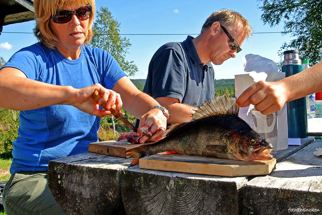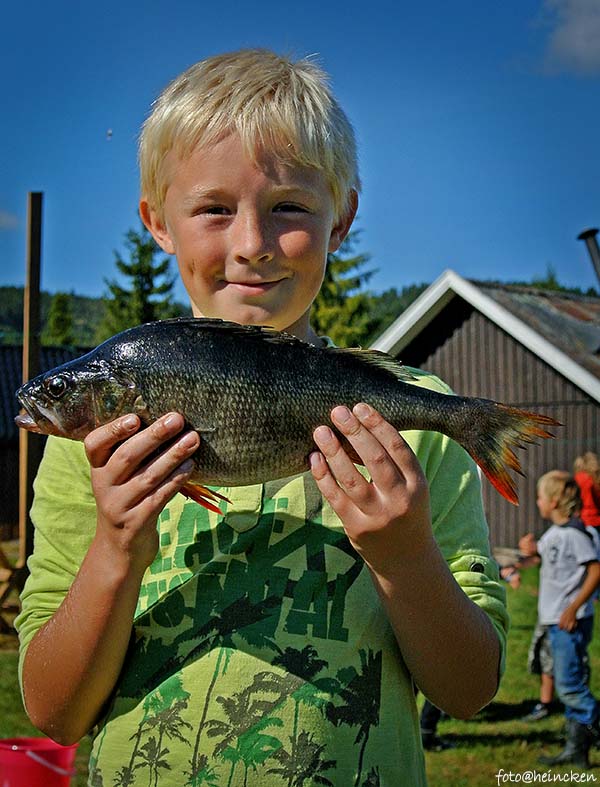 Sønnen til Dan som heter Bendik, er en ivrig fisker og tilbringer mer tid med fiskestangen enn noen andre på samme alder. Det første han gjør når han er ferdig med frokost, middag eller kvelds, er om å spørre om lov til å fiske! Fantastisk fint utgangspunkt når gutten blir eldre, synes nå jeg! Anyway, så var det da denne store tryten eller abboren som noen ønsker å kalle den, og her var Bendik rask fremme og ventet på at vekten skulle blir klar slik at vi kunne veie denne kjempen av en fisk. Som sagt veide den ca. 800gram og hadde en pukkelrygg av dimensjoner!