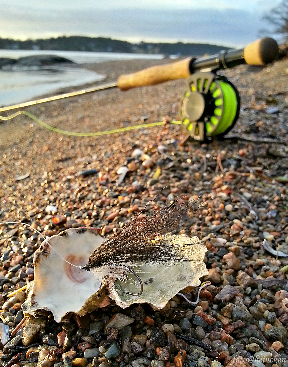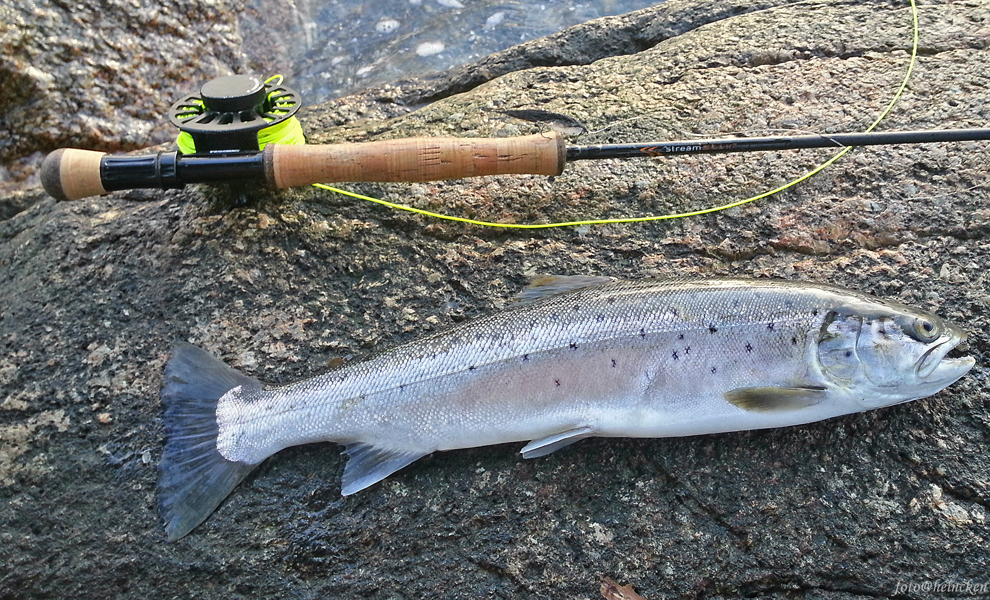 Ørret ble det også. Etter å ha vandret litt rundt om, så var det slag etter fluen, og jeg hadde skiftet fra en imitasjon av Børstemark til min tradisjonelle Sorte/Hvite som nå visste seg å være riktig for denne morgenen. 4 mindre fisker og 1 på 1,1 kg+ 1 av samme kaliber som slo seg løs inne på grunnen ble resultatet etter 2-3 timers fiske denne søndags morgen. En herlig start på dagen med blå himmel-og sol, skyer-og regn, vind-men fisk. Moro var det og jeg gleder meg til fiskemiddag der denne røde vennen skal bakes med masse stuff i buken til poteter og Sandefjords smør 🙂