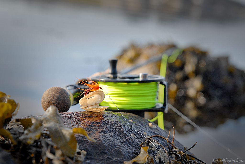 Vannstanden var ikke særlig å skryte av, for det var forholdsvist lavt vann og da jeg sjekket tidevannstabelen, så jeg at det var høyvann kl. 05:31 og lav vann kl. 11:50. Etter en kaffekopp fikk jeg øye på flere vak. Flotte fine rullevak og med ett fikk jeg en følelse at det kanskje allikevel kunne bli bra. Det var vindstille og krystallklart vann, så det var ikke de store skrittene jeg skulle ta før det så ut som Petter Wessel hadde seilet forbi. Jeg hadde ikke mer enn lagt fluen ut og tatt 2-3 drag med den oransje tangloppen, så røsket det i fluelinen. Det er så moro når man har en følelse av noe, så skjer det liksom! Det virket til å være en pen fisk og den viste seg også et par ganger i luften. Med 0,18 spiss og litt tålmodighet, håvet jeg denne vennen. Tykk og full av småfisk bøtet denne med livet. Det er nok flere som mener at fisk på 7 hg bør settes tilbake, men dette er god pannefisk, eller som jeg skal gjøre, legge den i røykovnen 🙂