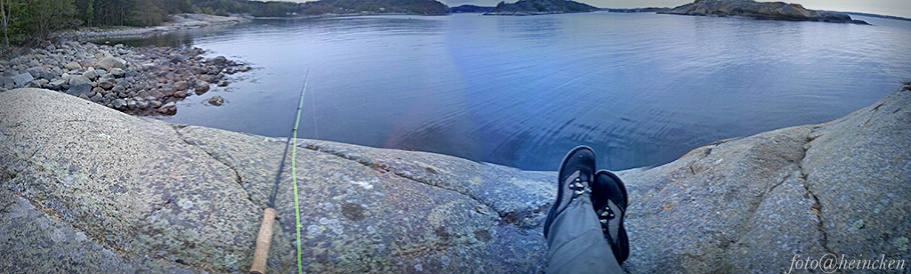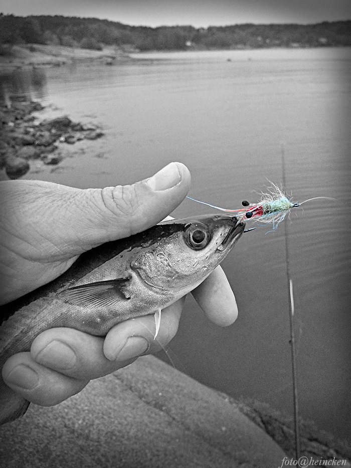 Jeg håpet det var sild som ble jaget, men slik var det ikke! Det var småsei som kom innover mot grunnen i store mengder. Det vaket og jeg hadde fast fisk på hvert eneste kast, noe som var morsomt, men det skulle gjerne vært sei av en litt større kaliber! Etter 22 sei ga jeg opp, for det ble lite spenning i dette når det ikke var noe størrelse på fisken. Enten jeg lot flue synke ned eller om jeg dro den så raskt inn som jeg bare kunne, kom sei´n etter og tok den lille reken.
