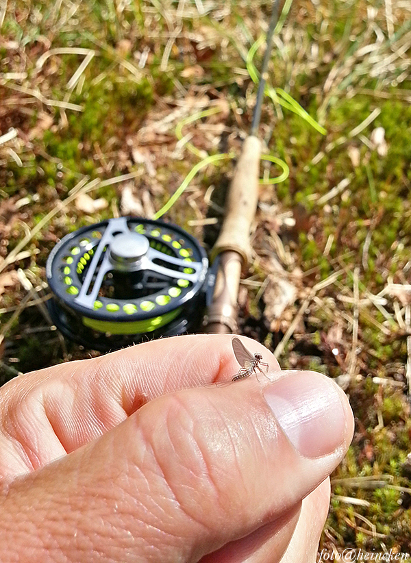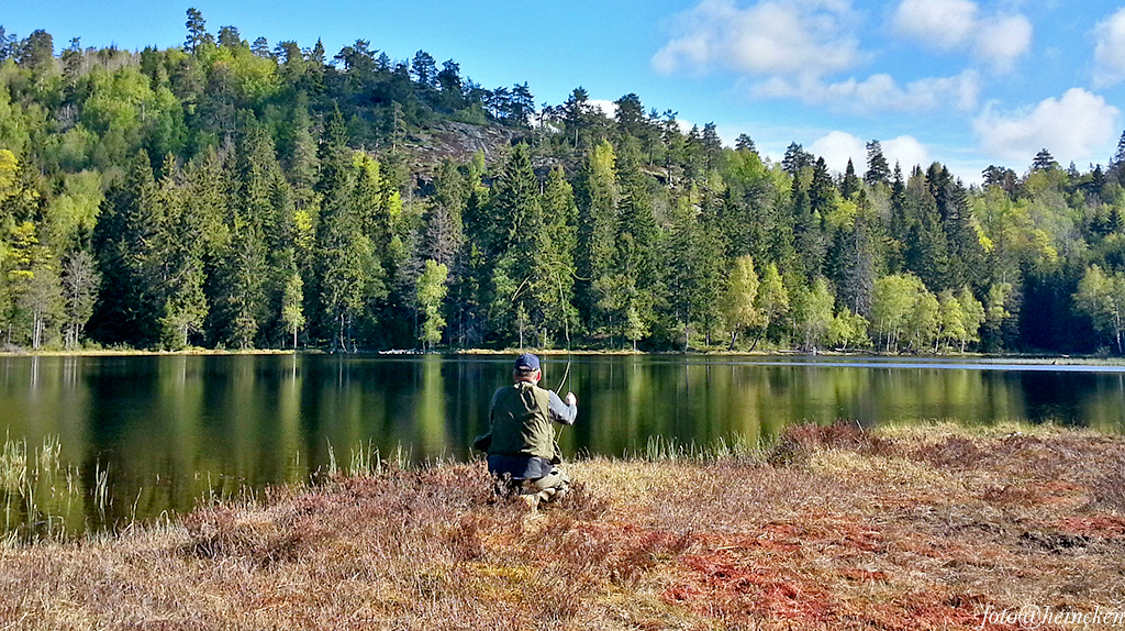 Endelig er tørrfluesesongen her og en etterlengtet tur er unnagjort hvor mye av nysgjerrighet er fjernet. Har snøen forsvunnet? Har døgnfluene klekket? Vaker fisken på duns? ….pluss en masse masse andre ting ble løftet bort fra skuldrene. Morten og jeg hadde pakket med oss litt og bestemte oss på morrakvisten hvor turen skulle gå. Etter litt konkludering, endte vi opp i et skogsvann på 278 moh og håpet å ikke møte andre fiskere der oppe, for det er det nemlig ikke plass til! Da vi hadde tråkket oss opp den enormt lange bakken, lå vannet der uten et eneste fluehue 🙂 Før jeg fikk gjort noe som helst, måtte jeg tømme varmtvannstanken, og lykkelig der jeg sto og ante fred-og ingen fare, flakset det opp en gressand femti cm fra der jeg lot vannet fosse. Jeg skvatt og brølte trolig så høyt at dem har hørt meg ned til Heisetra. Stakkars gressand som lå å ruget på eggene sine og var sikkert kjemperedd etter at denne tullingen nesten pisset på henne…