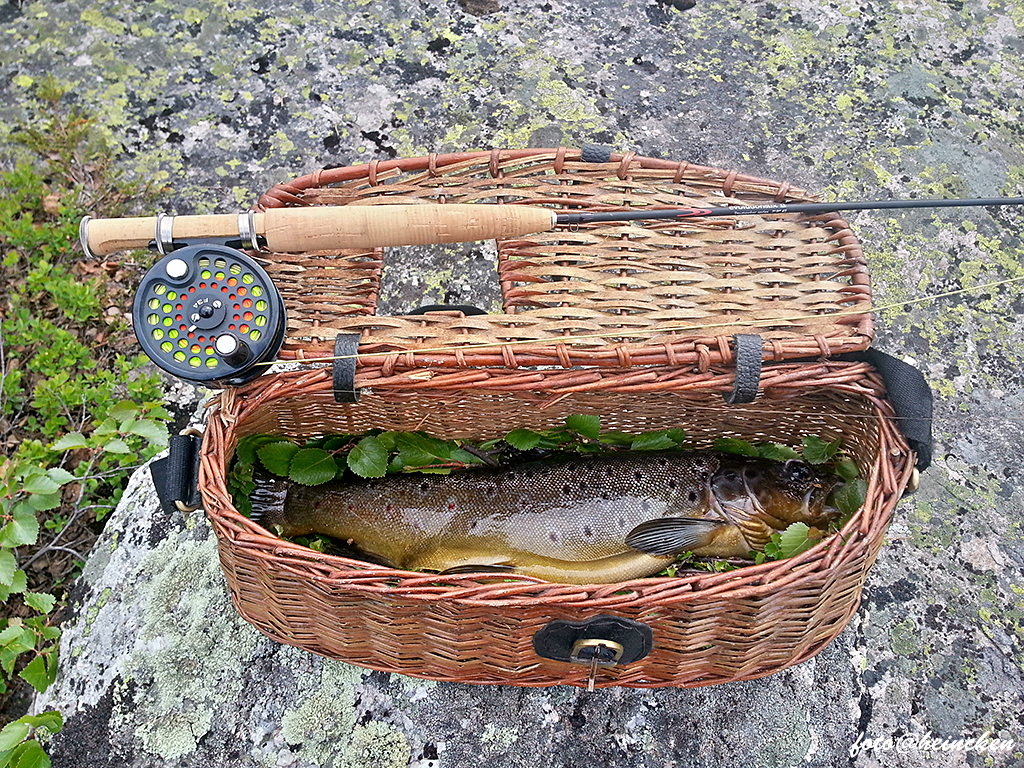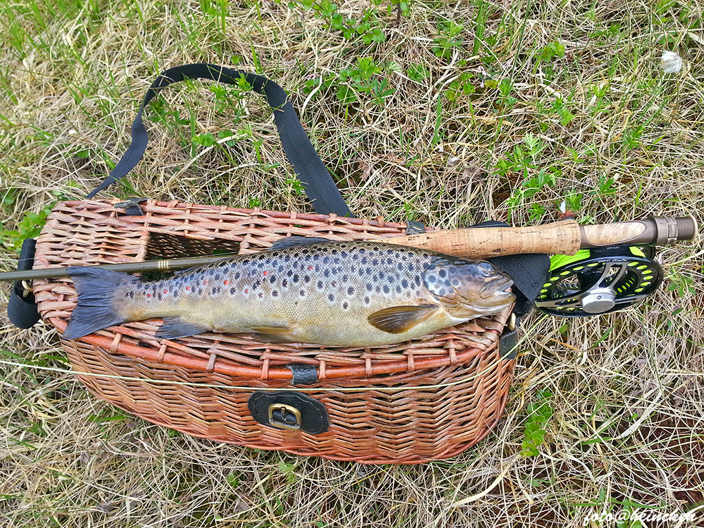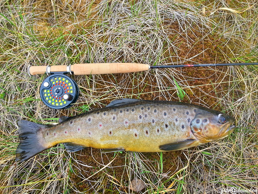 Men fisk ble det, og det på den nyinnkjøpte Streamstix #2 stangen 🙂 På suksessoppskrift vis satt jeg å speidet på vakende ørret som beitet og presenterte på så kunstnerisk måte jeg bare kunne, en brun parachute i krok 14 ut i området der fisken vandret, og ventet…og ventet….og vent….PANG, der tok den fluen min! Et vakker og godt tilslag ga meg og ikke minst fluestangen og morsom opplevelse, der ørreten på 930 gram kontrollerte bevegelsene mer en jeg hadde ønsket. Den var også proppfull av nymfer og var 43,5 cm lang med k-faktor 1,13. Fisk på denne størrelse synes jeg blir best å trekke i vann og ikke steke den. Synes fisken blir så mye mer saftig og blir det noe til overs så er dette godt også kalt, men hver sin smak 🙂