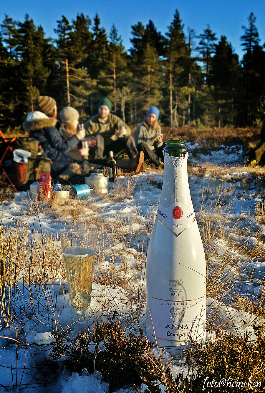 På selveste nyttårsaftenen satte vi kursen nedover Mathiaskilen og fant en fin plass der vi ble sittende helt til solen forsvant bak åskammen. Her var det duket for en god flaske Cava som vi hadde fått med oss hjem fra Cavafabrikken Codorníu i Barcelona denne høsten 2014, hvilket jeg faktisk anbefaler å legge turen innom fabrikken ca 50 min utenfor Barcelona, om man reiser til Barcelona. Vel, her ute i skogen ved det islagte vannet, rigget vi 6 oss til med bål, god lunch laget av Morten, kaffe med tilbehør og da en 12 måneds Cava. Hvor mye mer kan man forlange av den siste dagen i 2014?