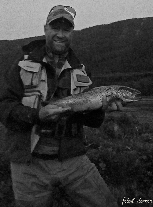 Etter at solen hadde forsvunnet bak horisonten, vinden la seg, elven lå der som et speil og myggen begynte å klekke, begynte også et veldig morsomt fiske. Jaja Ragnar, den la seg ikke helt denne vinden, men for å gni det litt inn, så ga Ragnar opp og satte kursen sammen med fler tilbake til hytten, men jeg fortsatte å fiske og fikk mye fisk. Mye smått under halvkiloen, men også flere fine fisker som tok Palmer myggen. Tror jeg var oppe i 12-15 ørret og mange av dem ble satt ut, noen ble aldri kroket og flere datt av, men en av dem satt godt! Jeg merket fort at dette ikke var en 6 hg fisk og i rennende vann blir fisk på 1250 gram tungt å kjøre på en klasse 4 stang. Da jeg omsider hadde ført den inn i hoven var det forholdsvis mørkt ute og jeg trodde jeg var helt alene og liret ut av meg et lite jubelrop, men det var jeg ikke! Morten sto litt lengre oppe og gjorde-opp noen av sine fisker. Morten hadde også fått en pen fisk inne i Spruterenna på 670 gram.