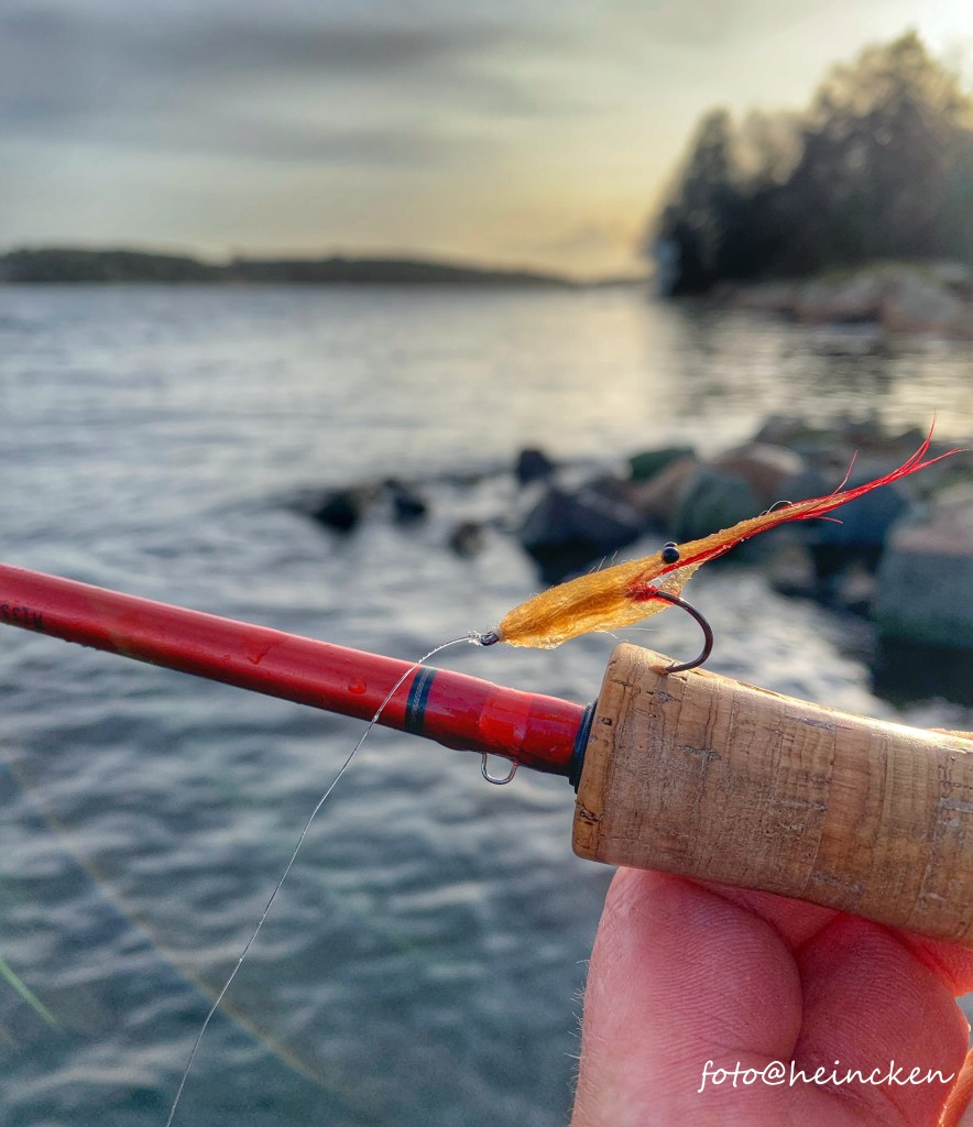 Etter en liten stund egen-nytelse var det å slenge litt og det tok faktisk ikke lange tiden føre det var fisk etter silde-imitasjonen, akkurat slik man ønsker seg! Gang på gang var det virvel etter fluen men ikke faan å klare å få fisken til å ta fluen! Etter 4-5 runder bak fluen, byttet jeg silde-fluen med en Vaskebjørn og hadde ikke tatt mer enn 2-3 drag i snøret så var det fast fisk. Veldig moro å kjenne fast fisk i den andre enden av snøret og dette er jo ikke noe jeg opplever hver gang, så moro for en spontan-fiske-som-meg.