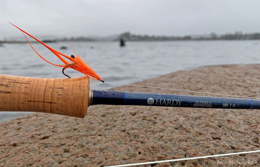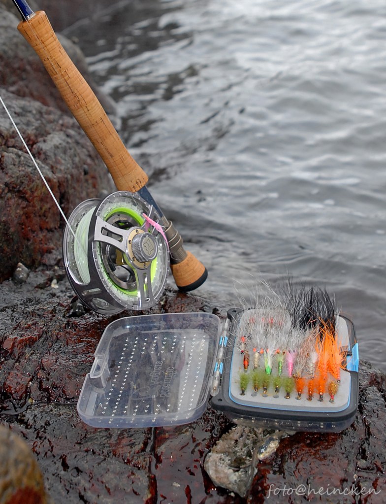 Jon S. skulle også ut å prøve seg etter disse prikkefantene så vi banket turen sammen og håpet på at Ragnar også skulle dukke opp, men han…skulle bake «7 slag» eller var det noe Rå-dyr-mat-greie….vet vet! Uansett så var det forholdsvis sur nordavind med +3 gr og noen få drypp fra den konstant gråbelagte himmelen. Hvor mange uker har det vært overskyet og regnet nå? Er vel snart på tide at solen kommer frem og bistår litt for å la minnet minnes hvordan denne solen ser ut! Vel fremme ved fiskeplass ytterst i havgapet, oppdaget jeg at noe vesentlig var glemt igjen hjemme! Hva mer enn flueboks og røkte kjøttpølser trenger man? Jo. en fluestang for eksempel! Jeg hadde pokker glemt fluestangen hjemme! Senere på dagen fikk jef vite at den var trygt lagt inn og at den lå utenfor, men flaks for meg, og kanskje ikke helt uventet så hadde Jon-Kanon en ekstra #6 med seg og ikke en hvilken-som-hels- stang, men en Hardy Zephrus Sintrix 440 SWS 9´#6 T.