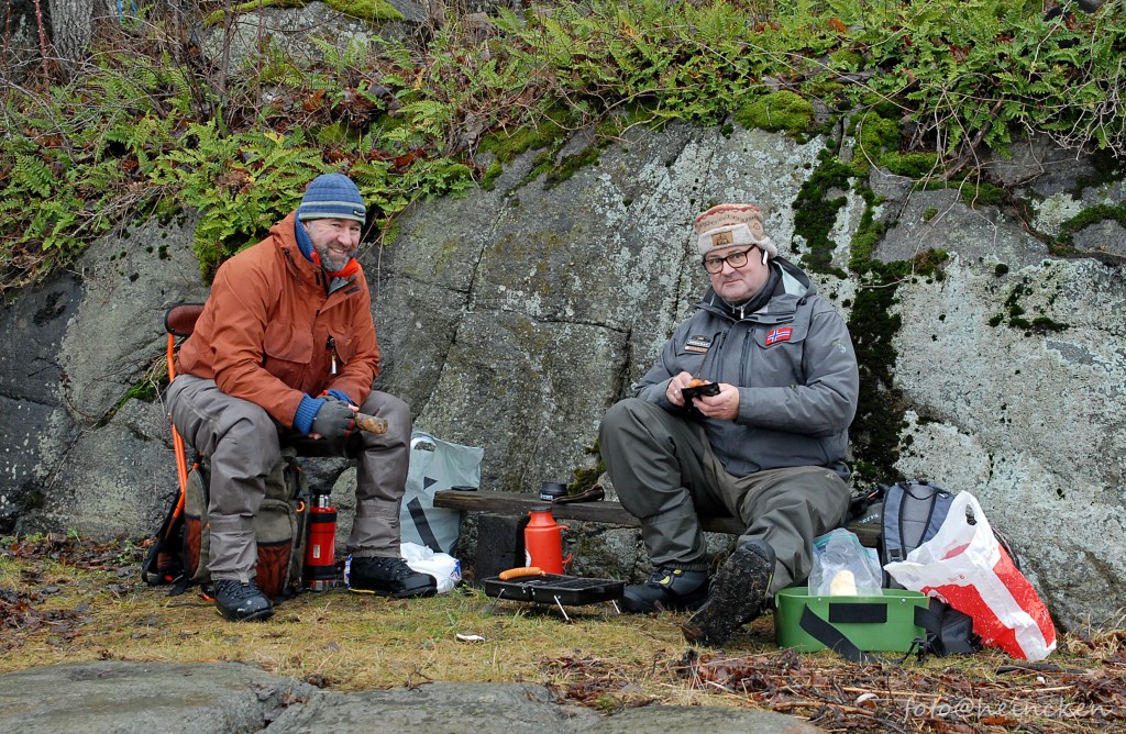 Varm kaffe og godt grilla Skinnfri Røkte Kjøttpølser gjorde virkelig underet og kroppen var klar for en ny runde, men denne gang forhalte vi lengere inn i fjorden der solbrune kropper vanligvis ligger å blafrer med toppløse pupper og sprettrumper. Her fisket vi oss rundt i et område med godt blandet bunnforhold. Da klokken nærmet seg 15 kom mørket sigene sakte men sikkert og vi konkluderte vel med at dette var en dag med mye god prat om jobb, arbeidsgivere, fluestenger og alt annet rør. Viktig å kunne prate ut og i tillegg da med andre som faktisk bekrefter og forteller om tilsvarende ting man selv opplever!