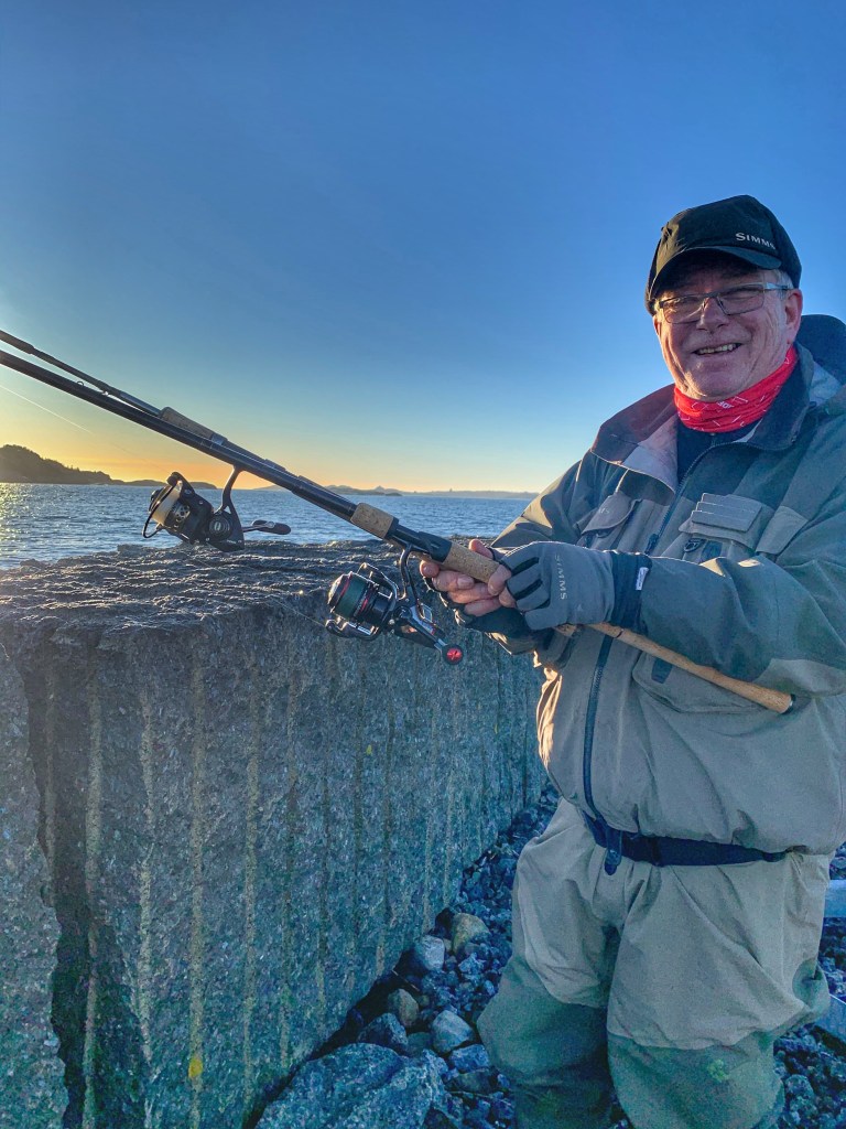 Tanken var jo å fiske i går, altså lørdag, men da kastet også jeg inn håndkle å heiv på meg tur-klærna å gikk tur med den andre halvdelen og fatter, MEN det har vært noe «klaging» på at det er for kaldt å fiske, så heldigvis var dagen i dag en slik søndag da gradestokken viste kun -2,5 ute og minimal vind. Sjø-temperaturen ligger fra +2,5-+5 grader nå så det er forholdsvis kjølig også på de edlere deler av kroppen når man står med saltvann opp til hoftene for å komme lengere ut der kanskje det står noen prikkefanter!