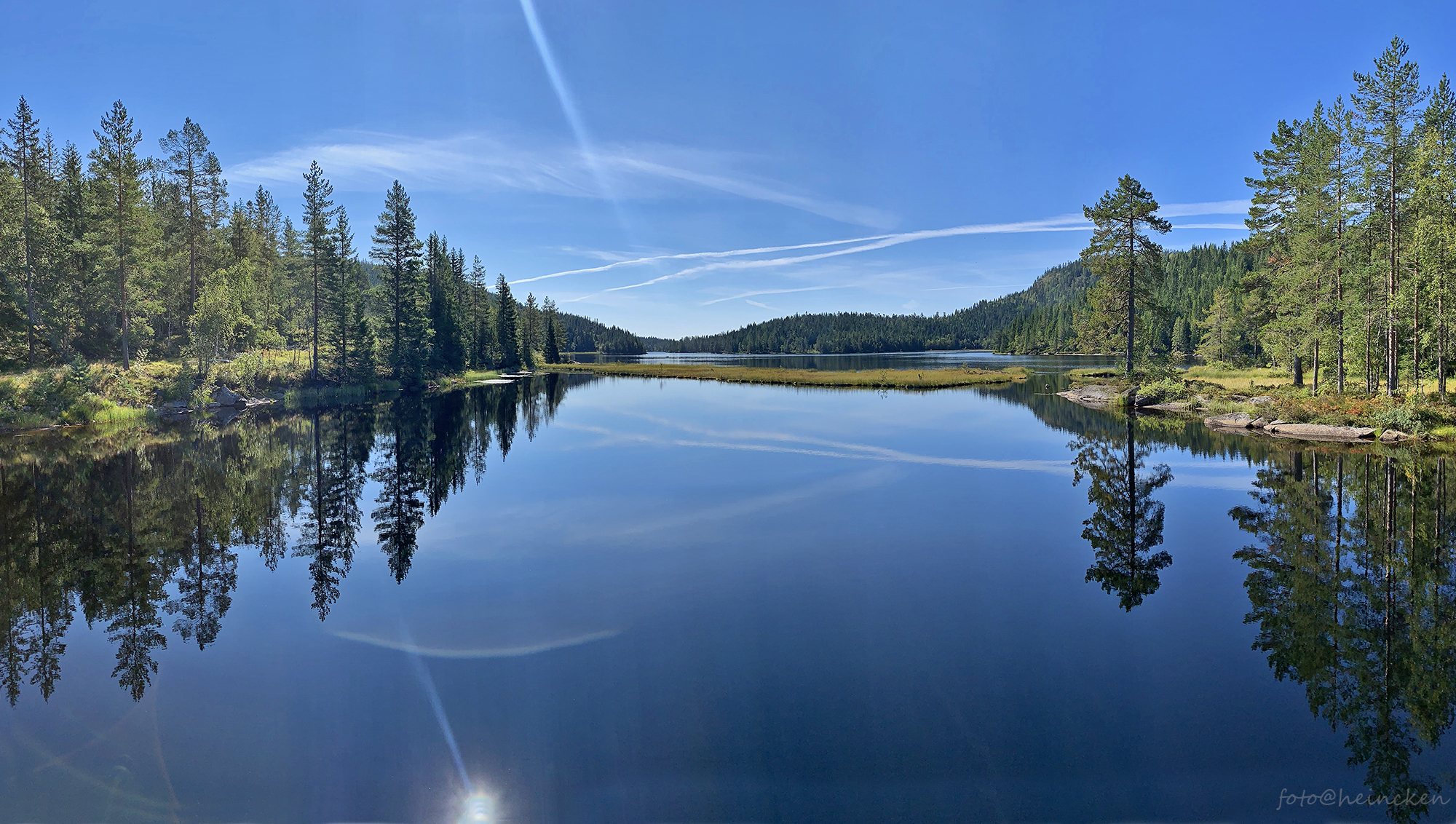 Etter som kvelden tok tak i ettermiddagen, la den lille brisen som var seg helt og det ble som et speil å se på utover vannet. Igjen dukket denne fantastiske flott ørnen opp på himmelen, nå noe lengere vekk fra meg, men allikevel ikke vanskelig å se. Med de kjente vite merkene under vingene sine, svevde den rundt over vannet og kanskje var også på jakt etter noen feite fine ørreter til sine unger, hvem vet!