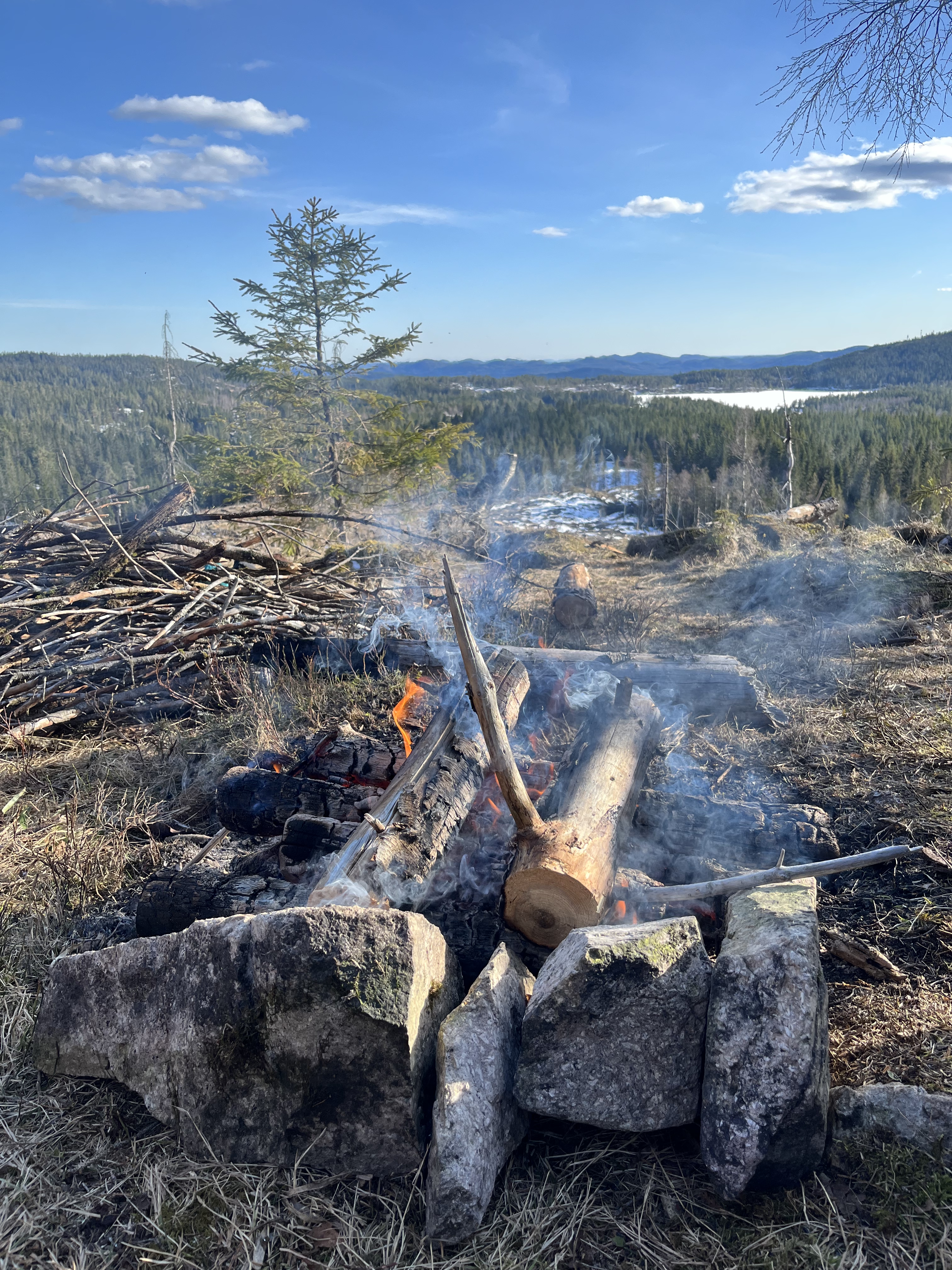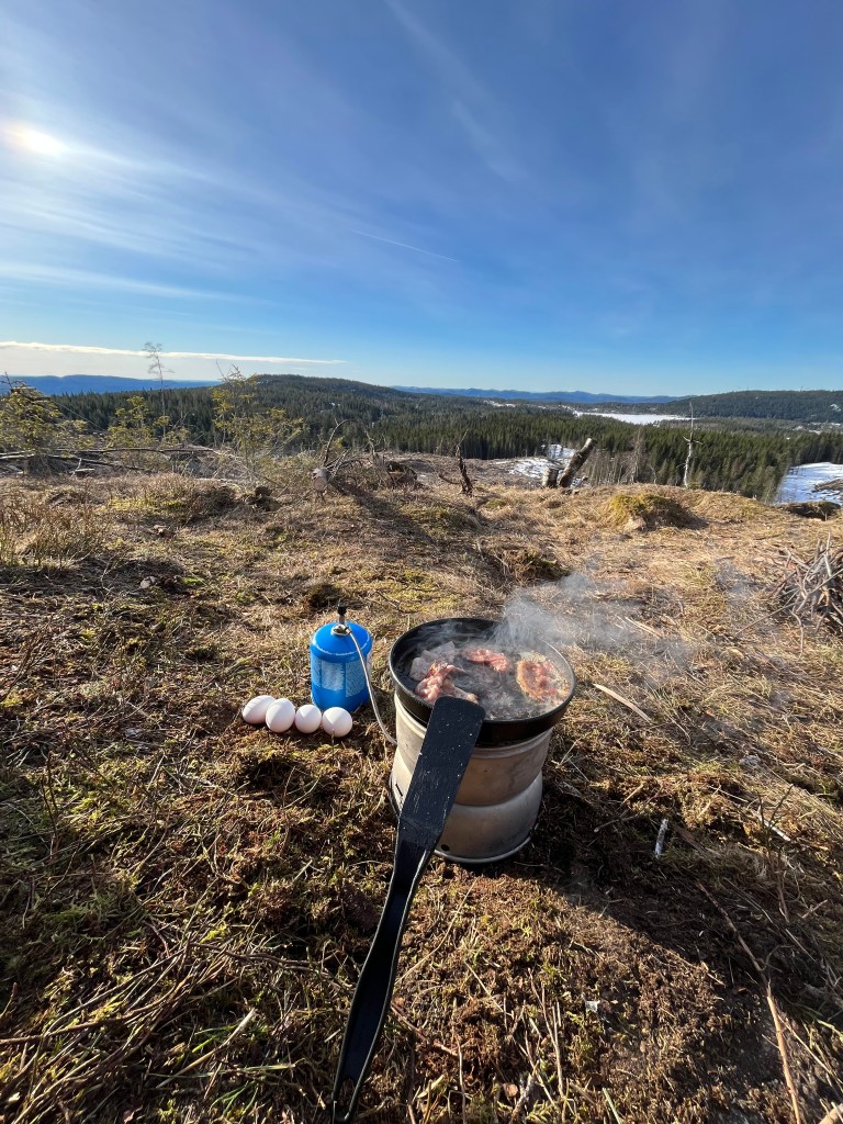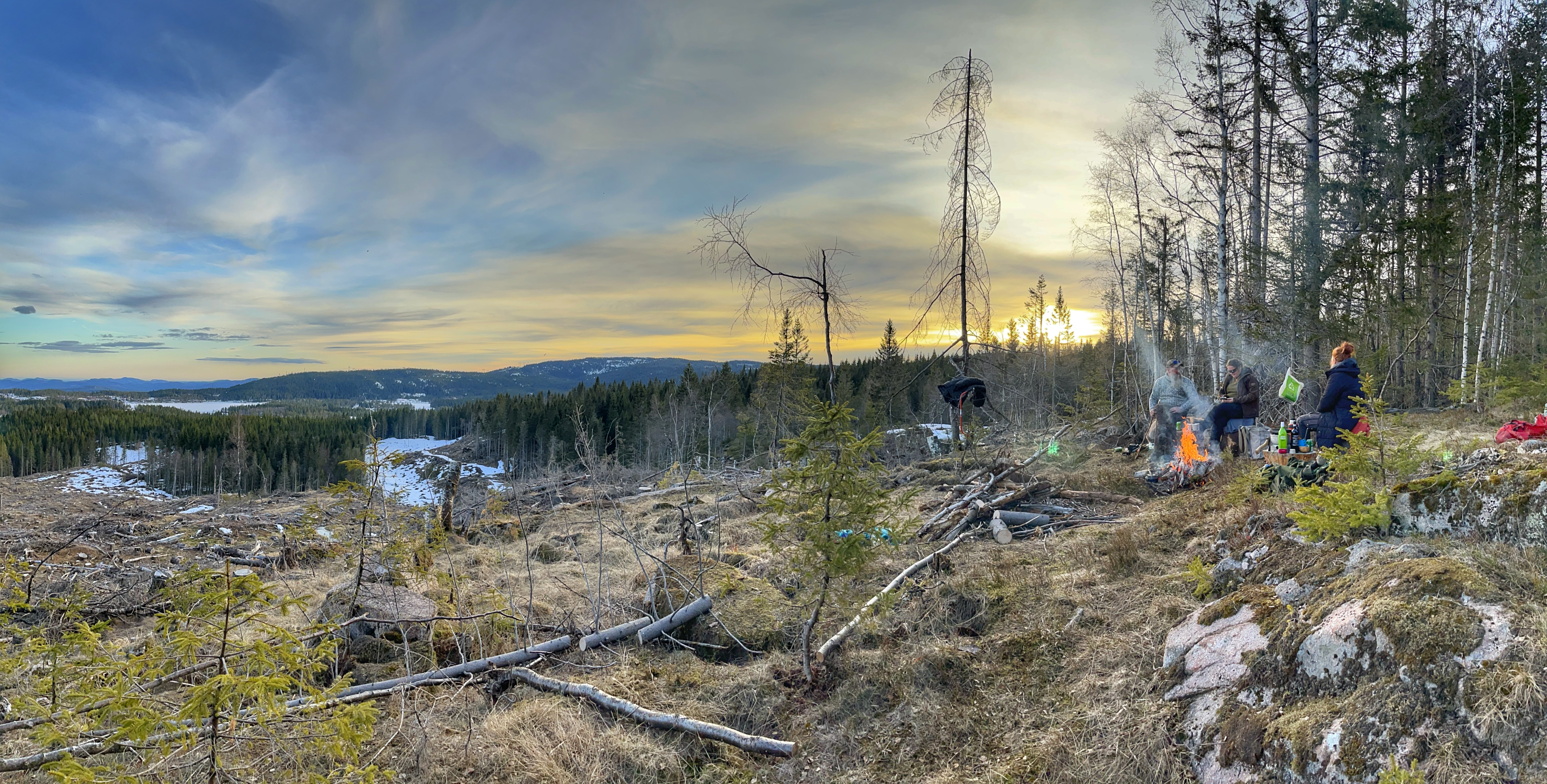 Ole og Føbe hadde blinket ut en plass ovenfor et hogstfelt der det skulle være fint å tilbringe ettermiddag, kveld, natt og morgenen, og ettersom værmeldingen sa at det ikke ville bli noe nedbør men svak bris fra nord-vest var dette en fin plass for å lage til en camp. Helt perfekt var plassen ettersom man hadde nok fyringsved fra området som ble hogd for 2-3 år siden og med sunn fornuft lagde vi et aldri så lite kaffebål til pølser og kaffe.
