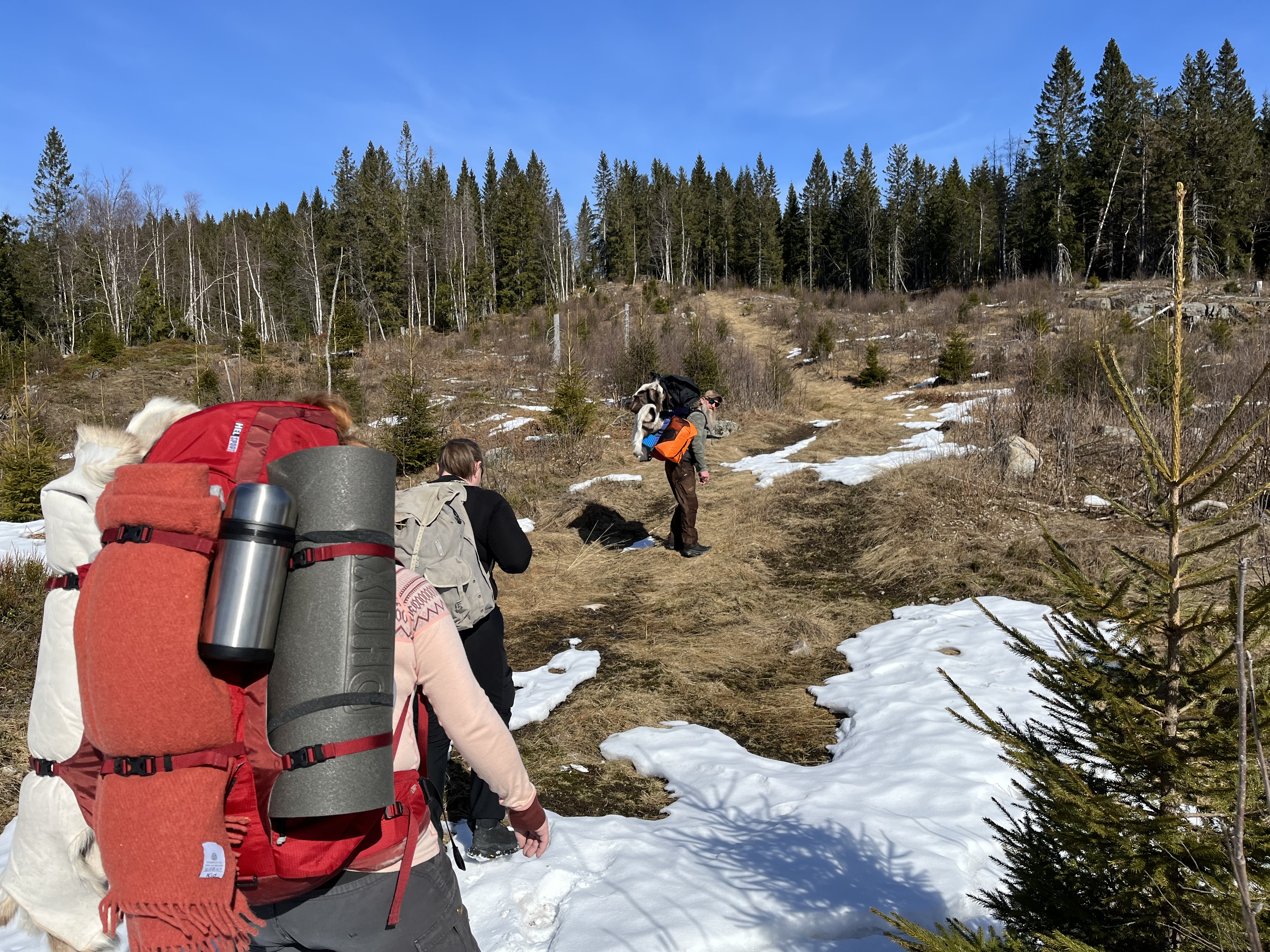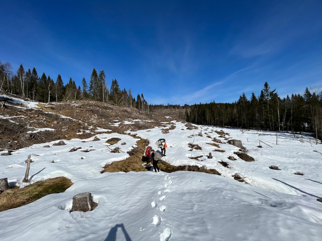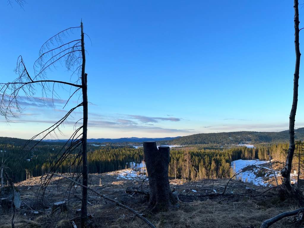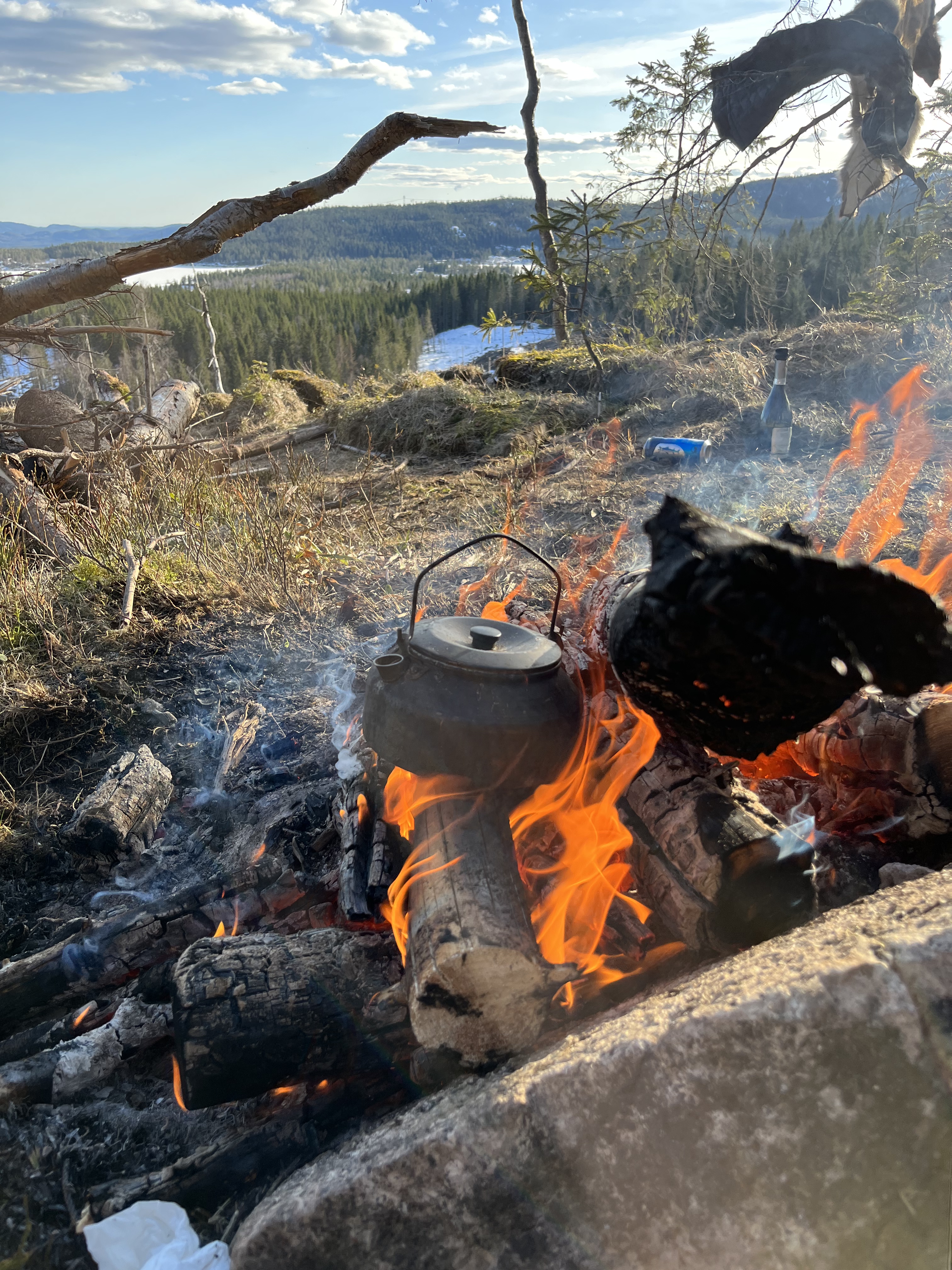 Ole og Føbe hadde blinket ut en plass ovenfor et hogstfelt der det skulle være fint å tilbringe ettermiddag, kveld, natt og morgenen, og ettersom værmeldingen sa at det ikke ville bli noe nedbør men svak bris fra nord-vest var dette en fin plass for å lage til en camp. Helt perfekt var plassen ettersom man hadde nok fyringsved fra området som ble hogd for 2-3 år siden og med sunn fornuft lagde vi et aldri så lite kaffebål til pølser og kaffe.