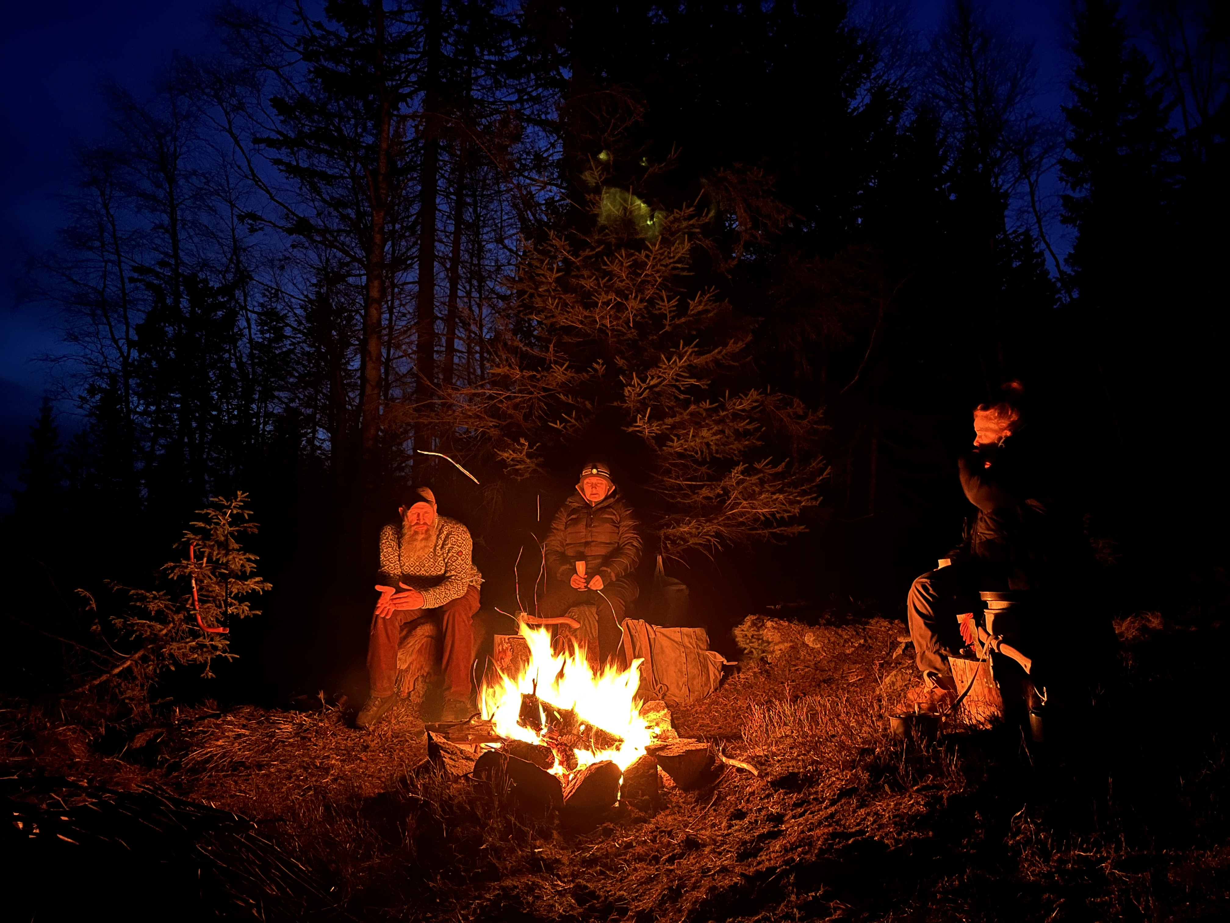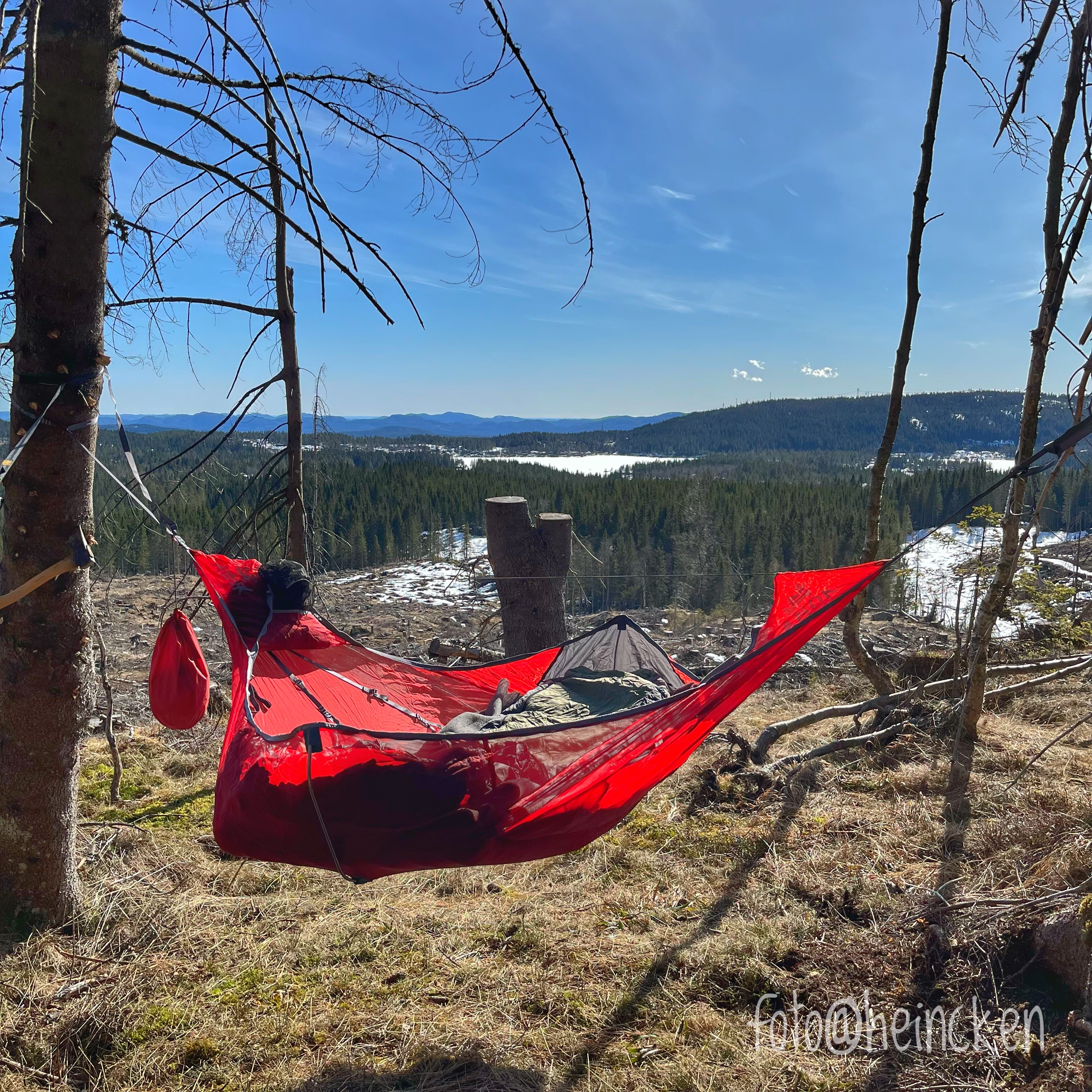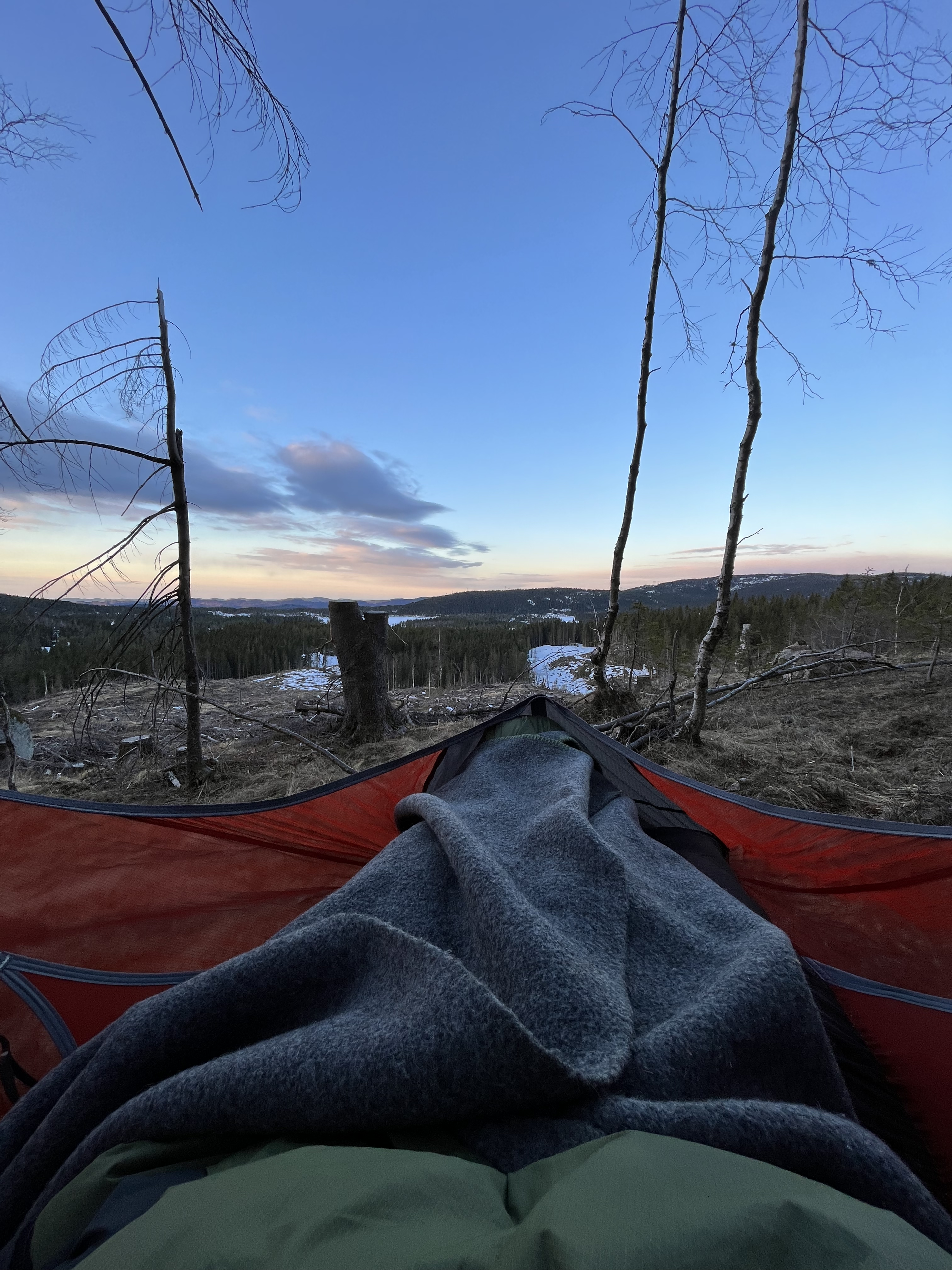 Med spillet Alias på telefonen, varmt bålkos og masse hygge ble det god natt og hengekøyene skulle benyttes for første gang dette året. Anne og undertegnede hadde funnet et felles tre som var delvis rotveltet i en-eller-annen storm men vi satset på at det holdt oss gjennom denne natten, hvilket det også gjorde, heldigvis! Ole og Føbe hang i noen trær like ved oss og alle kom seg gjennom en natt med minus grader, så da solen skinte rundt hjørnet var klokken 7:30 og en varm kopp kaffe til fuglekvitter var absolutt en fin start på denne søndagen.