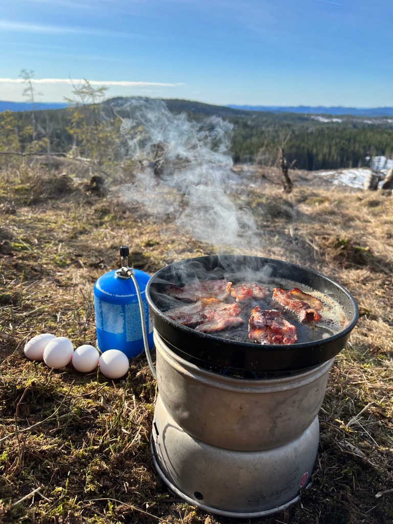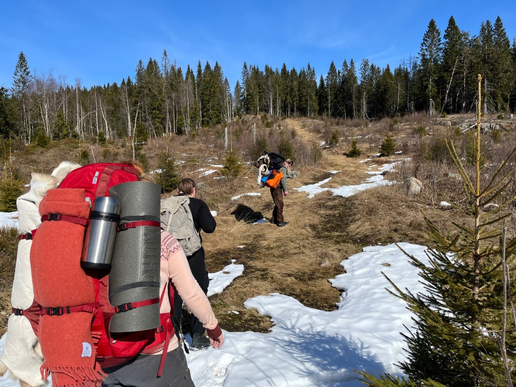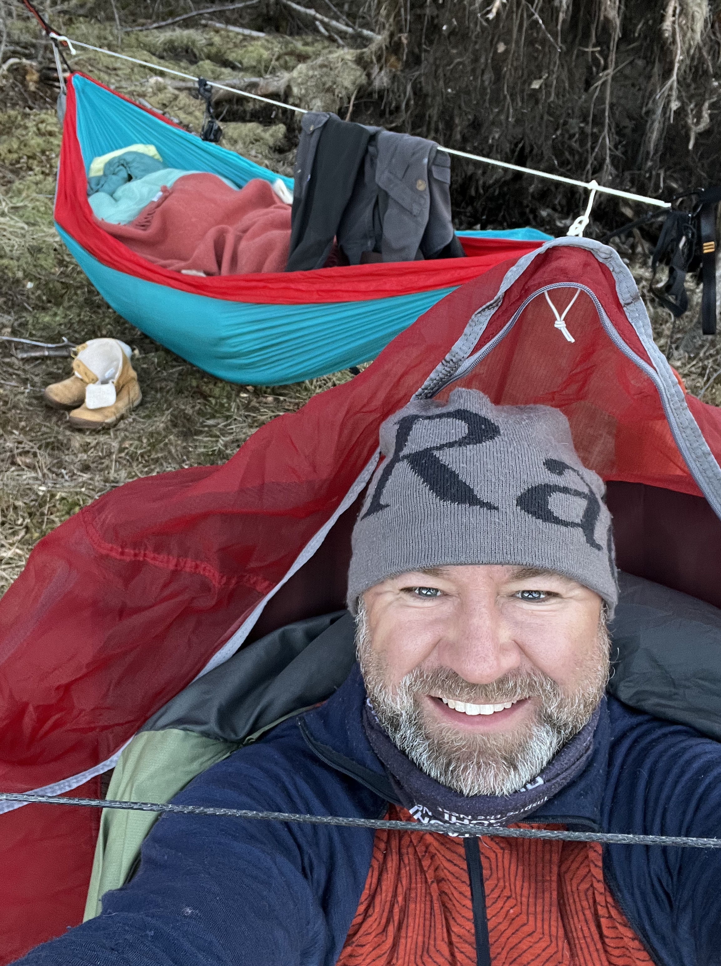 Med spillet Alias på telefonen, varmt bålkos og masse hygge ble det god natt og hengekøyene skulle benyttes for første gang dette året. Anne og undertegnede hadde funnet et felles tre som var delvis rotveltet i en-eller-annen storm men vi satset på at det holdt oss gjennom denne natten, hvilket det også gjorde, heldigvis! Ole og Føbe hang i noen trær like ved oss og alle kom seg gjennom en natt med minus grader, så da solen skinte rundt hjørnet var klokken 7:30 og en varm kopp kaffe til fuglekvitter var absolutt en fin start på denne søndagen.