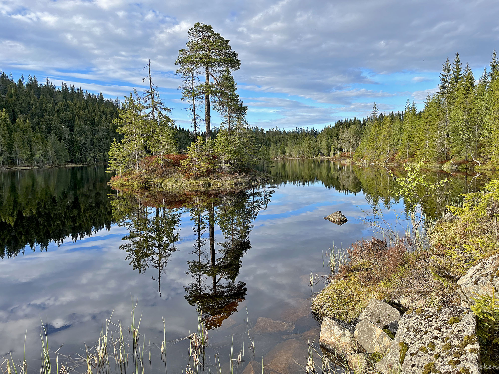 Sol fra mer eller mindre knall-blå himmel var en fantastisk start men da OP våknet 1,5 time senere var det allerede blitt delvis overskyet, men fremdeles minimalt med vind, så vi pakket camp og gikk en siste tur avgårde for å prøve fiskelykken i de dype skoger i ….