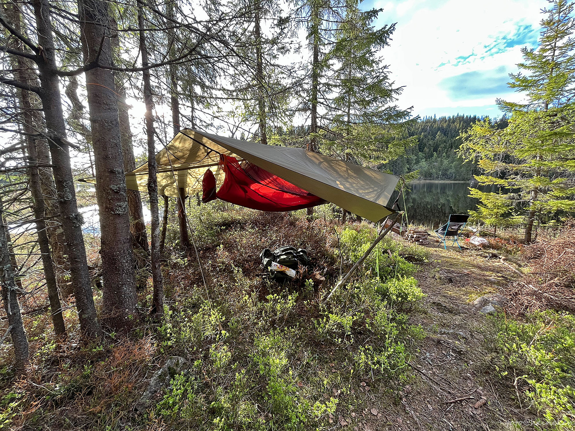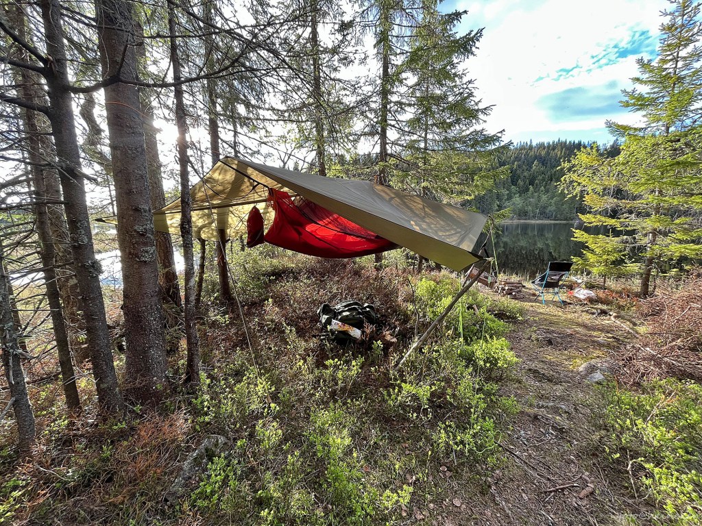 Det er siste helg i mai og Ole Petter hadde invitert til tur for å prøve fiske samt overnatte i hengekøye eller selvsagt telt da, men for oss to ble det hver vår hengekøye. Værmeldingen var så som så, og da var det også et klokt valg å henge opp en tarp!