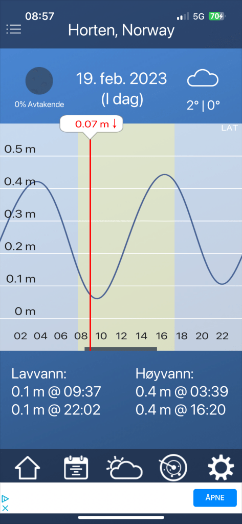 Båten ja….jo den lå tørt nå og i Tidevannstabellen sto det at det ikke skulle bli høyvann igjen utpå formiddagen! Var det slik at jeg skulle bli igjen på plassen til langt utpå dagen?