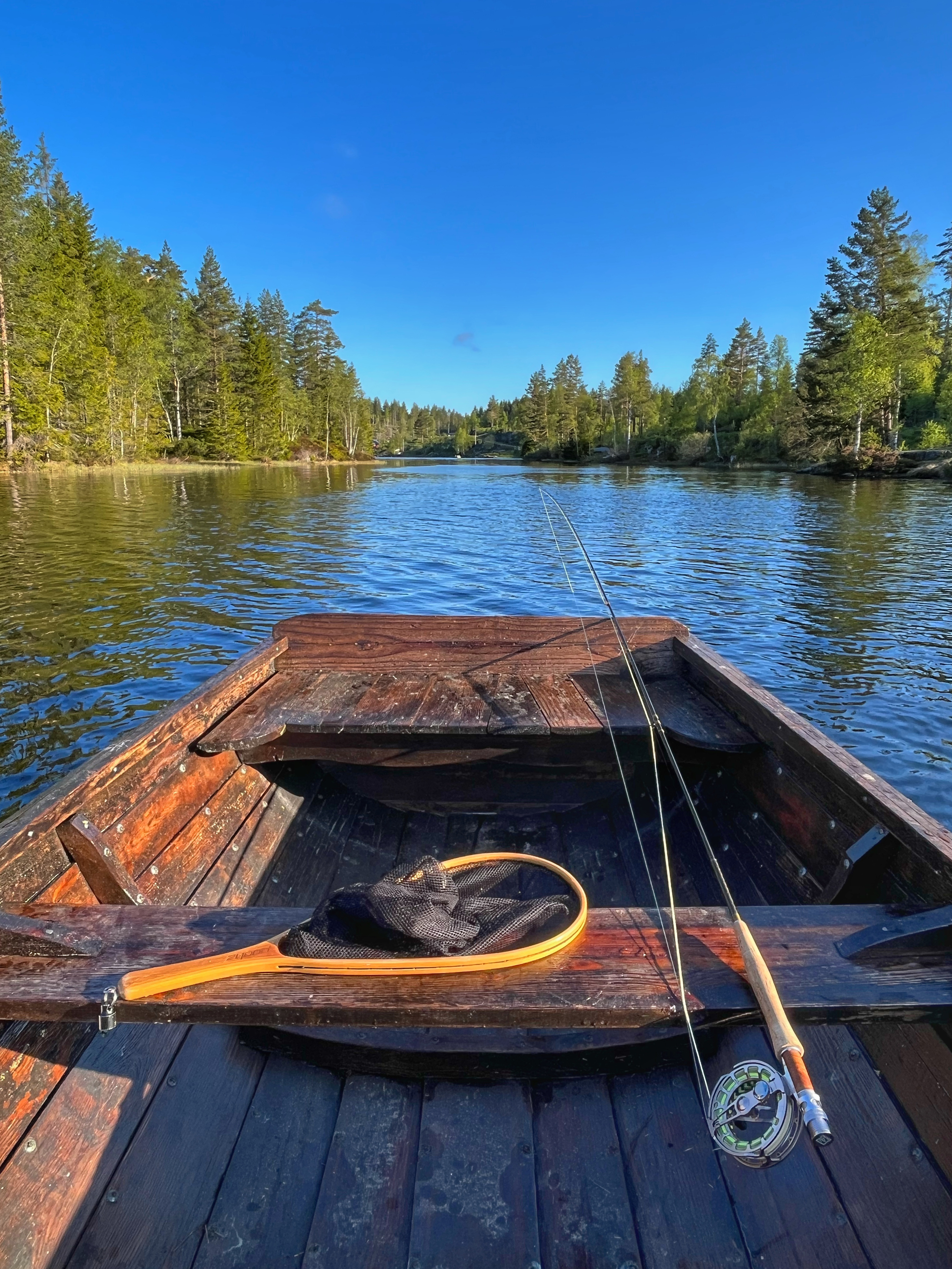 Søndagen ble noe roligere men mere vind, noe som ikke er like morsomt når fiske ikke er skikkelig igang og man skal sitte i en båt som fyker frem-og-tilbake, men litt utpå formiddagen var det igjen tid for å øse litt vann ut av treprammen og ta åretakene ut på «blå-myra» der fisken vaker på klekkende insekter.