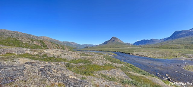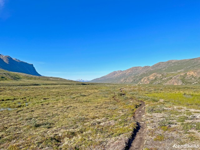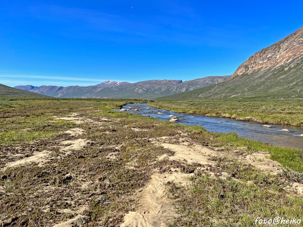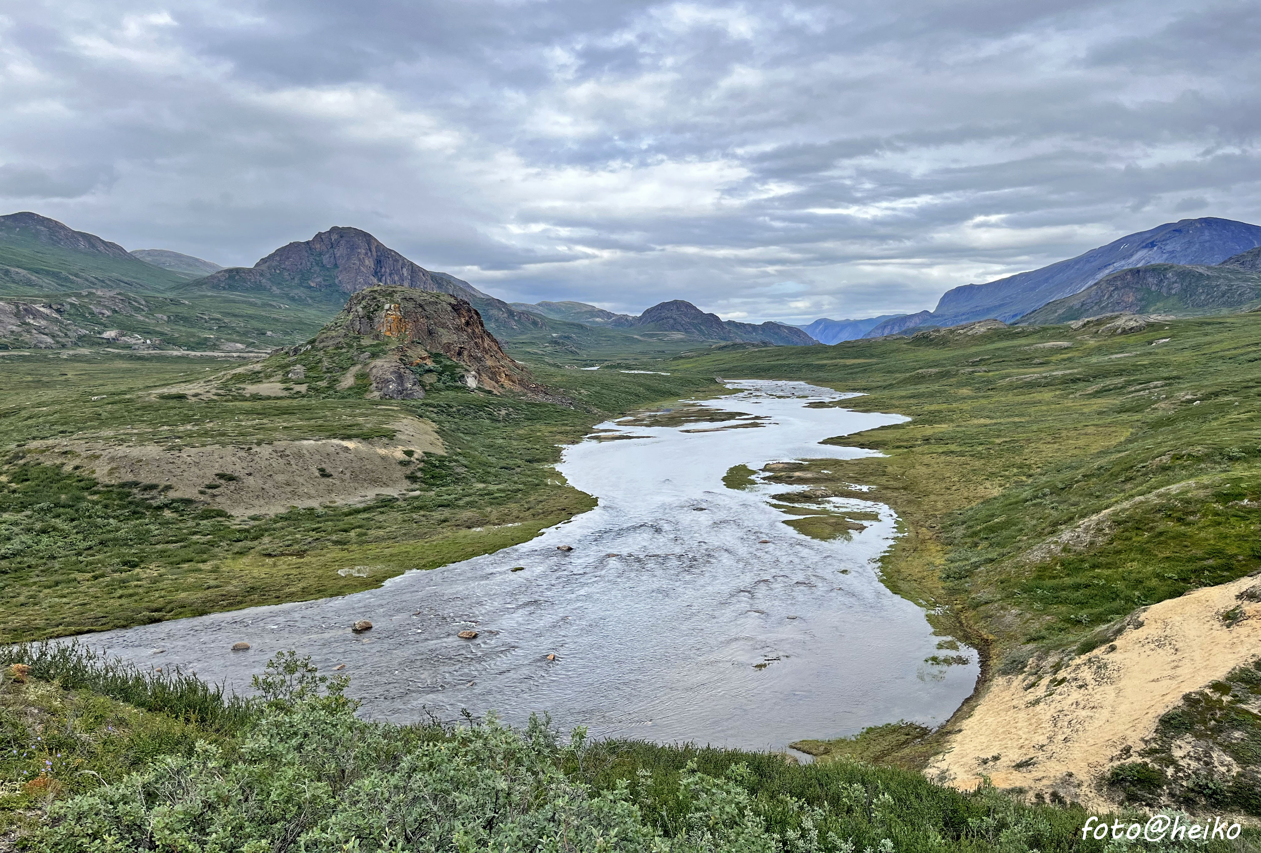 Vi har bestemt at vi blir med Peter opp til «Waterfall» som ligger lengst unna. For å komme inn ditt var båt en nødvendighet og noe som tok en halvtimes tid i en vakker dal der vi så Havørn og Caribou i en natur man sldri vil glemme! Store kraftige fjell på begge sider medgrønne, frodige fjellsider. Man er virkelig i ødemarken selv om dette er et område som Inuitter har drevet jakt og fiske i mange mange år og som ble et område Loop engang startet forskning i for å finne ut mer om fiskebestandene, likt som dem gjorde på Kola i Russland.