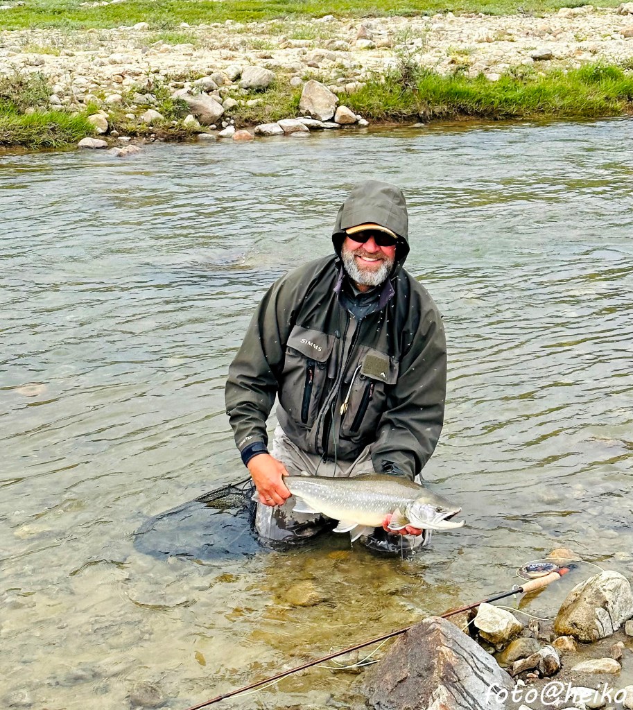 Etter noen timer beveger vi oss til området der man krysser elven og her er det bra! Ettersom jeg fikk mange fisker her, tenkte jeg å prøve Copper John som er ei lita nymfe, og fisken tok momentant! 2,8kg og løpetur nr 2 i dag etter fisk nedover elven.