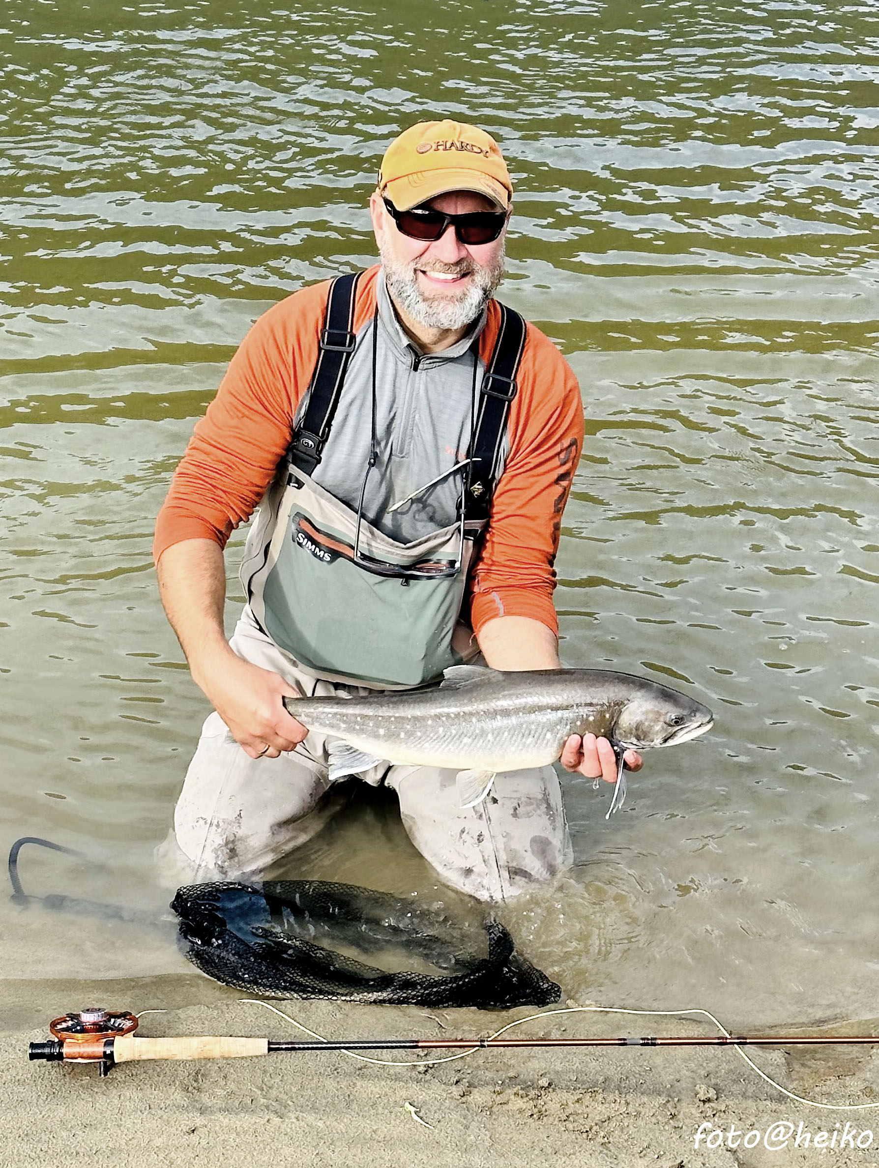 Vi valgte «Tribiutary» som er deltaen der sidelven renner inn i hovedelven og det tok meg 2 kast på samme plass som for 2 dager siden, så var første fisk landet. En vakker fisk på 3,4 kg som ga en skikkelig runde nedover og som satte fluelinen inn i lillefingeren min da jeg prøvde å holde igjen med finger på snøret.