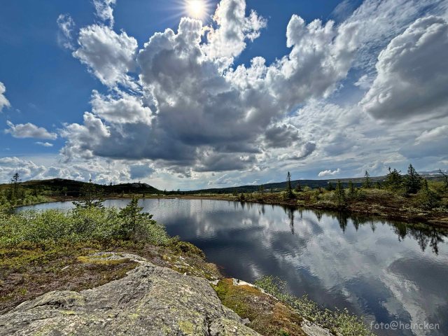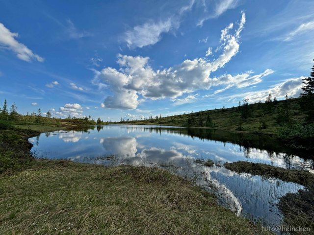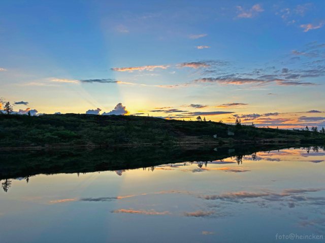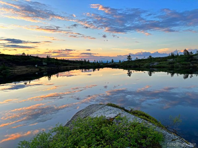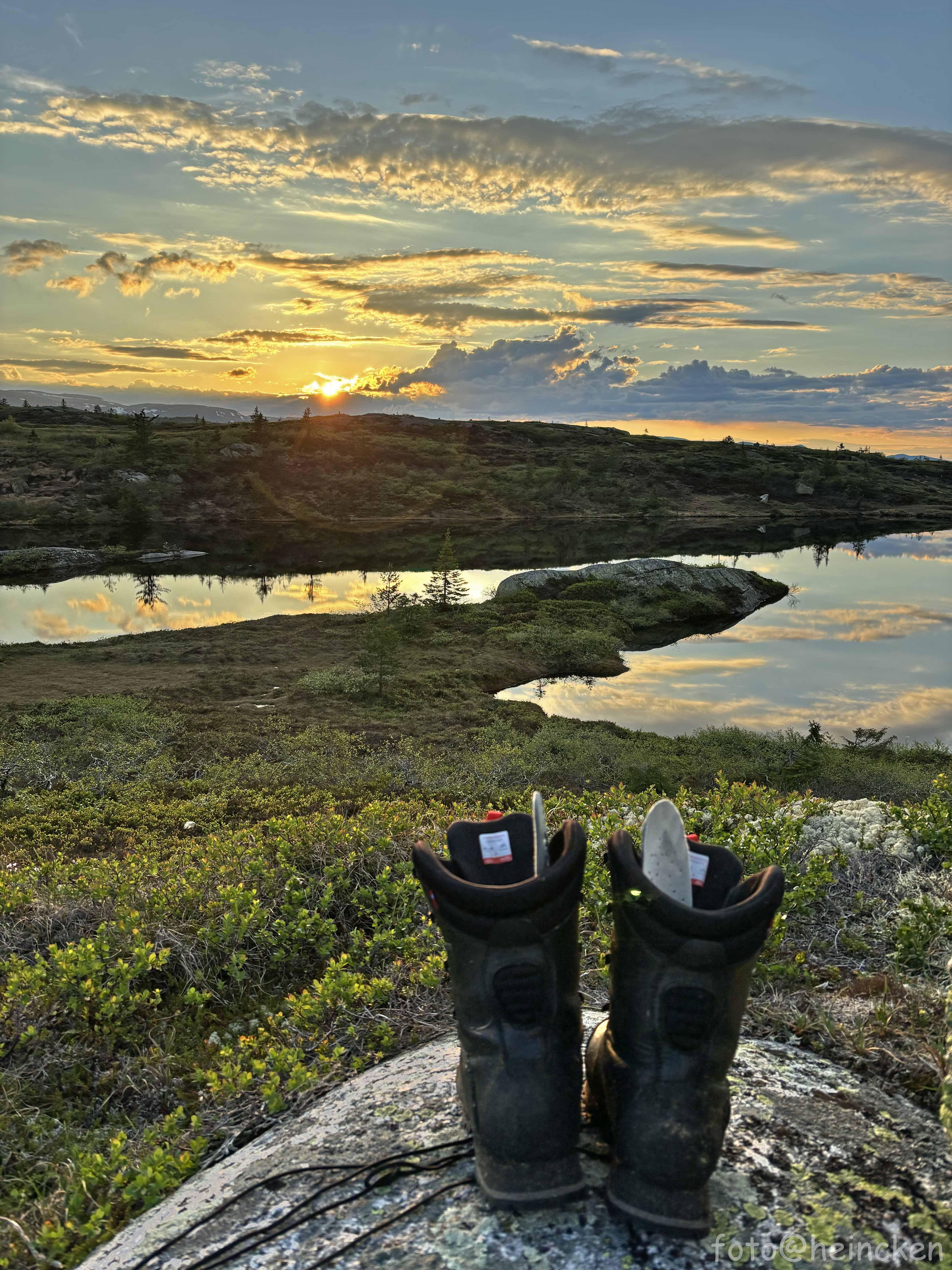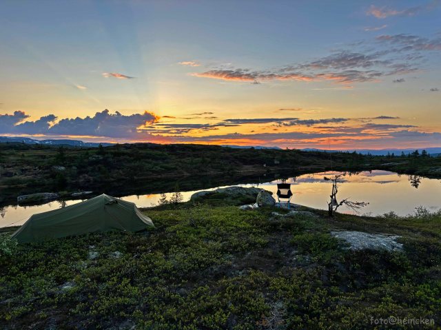 Var det over her også allerede? Var det fisketomt? Med en litt fortvilet opplevelse gikk jeg siste biten opp og lagde meg en god, etterlengtet RealTurmat med Biff 😍 til en aldri så liten skvett med V.S.O.P. og nøyt den fantastiske utsikten utover det blikkstille Grønnfiskevannet som det over-hode ikke skjedde noe på, foruten om noen ender da som freset frem-og-tilbake, og etter en velfortjent middag, satte jeg fjellstøvlene i retning av Gamp og Rundevann, vel overbevisst at Rundevann skulle levere! På turen nedover stusset jeg igjen på dette med insekter for nå var klokka 20 på kvelden og det burde være mygg eller knott, hvilket det ikke var, og riktignok nede ved vannene der det burde vaket, kunne man fint speile seg eller snu bilder på hode og undre seg over hva som er speilbilde og orginalen, altså ikke så mye som et insekt eller vak her heller, og det var i dette nuet at konklusjonen ble sagt: Det er faan for tidlig Heiko!
