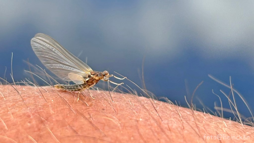 Selv med så kraftig vind, klekket det døgnfluer, og det klekket MYE! I store samlede flak kom dem nedover og Ragnar mendte det var lenge siden det har vært så store Aurivilli klekkinger som denne dagen, noe som er veldig positivt å se ettersom det for noen år siden omtrent ikke var vann i elven og ECO sa at: Jo da, det går 5 kubikk, hvilket ikke er noe! Da ble det ikke noe insekter, men i denne vinden klekket det og jeg fikk brått øye på noen sippvak i en av riflene øverst i oset og vadet meg rolig oppover i håp om ikke å skremme de få fiskene som nå var synlige.