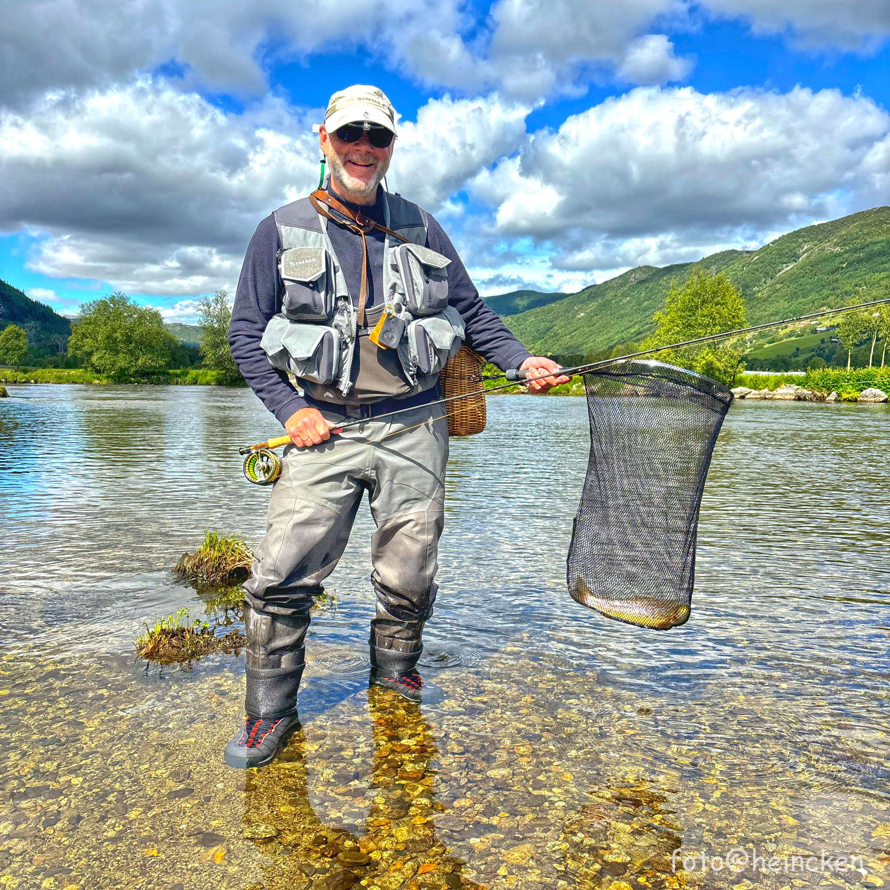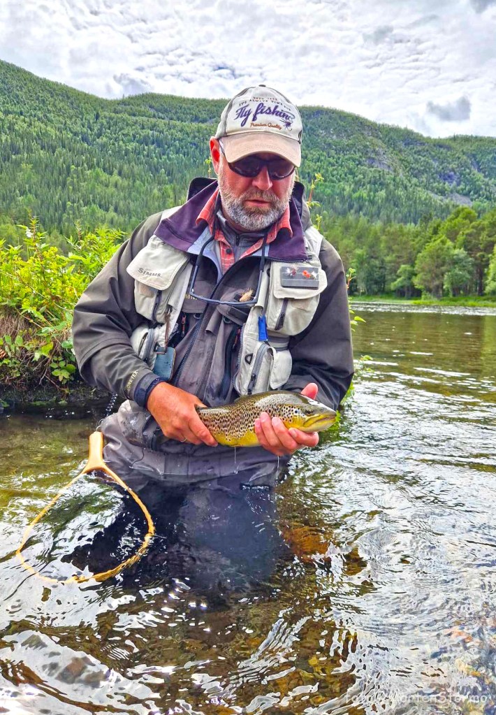 Så etter litt lett blanding av rester fra dagene, var det igjen ut fra hytta, tilbake men denne gang langt ut i fjorden der det måtte være en saftig suppe av døgnfluer etter dagenes klekkinger, og med godt mot vadet vi oss ut langs rennene der det før sto mye fin stor fisk som sjeldent var mindre enn 8-9 gh men ofte stor fisk fra kiloen og oppover. Slik ble det ikke, og det er blitt stor endring i dette vassdraget, og dette stemmer også med tidspunktet da grunneier av vannet åpnet for drift av fiske med garn, der fisken selges til hotel og hytter, og som er den størrelsen fisk som skal settes tilbake som er 40cm og oppover. Jeg påstår at å drive kultivering er veldig viktig av vannene i Norge, men at man tar ut størrelse 40 cm og oppover for kommersielt salg, ødelegger vassdragets eget øko-system der det er den store fisken som er den viktigste predatoren som spiser mindre yngel og som også er den som er grunnlaget for gyting av kommende generasjoner i elven. Ja til tynningsfiske og kultivering, men nei til aktivt garnfiske som ødelegger stabiliteten i årsklassene!