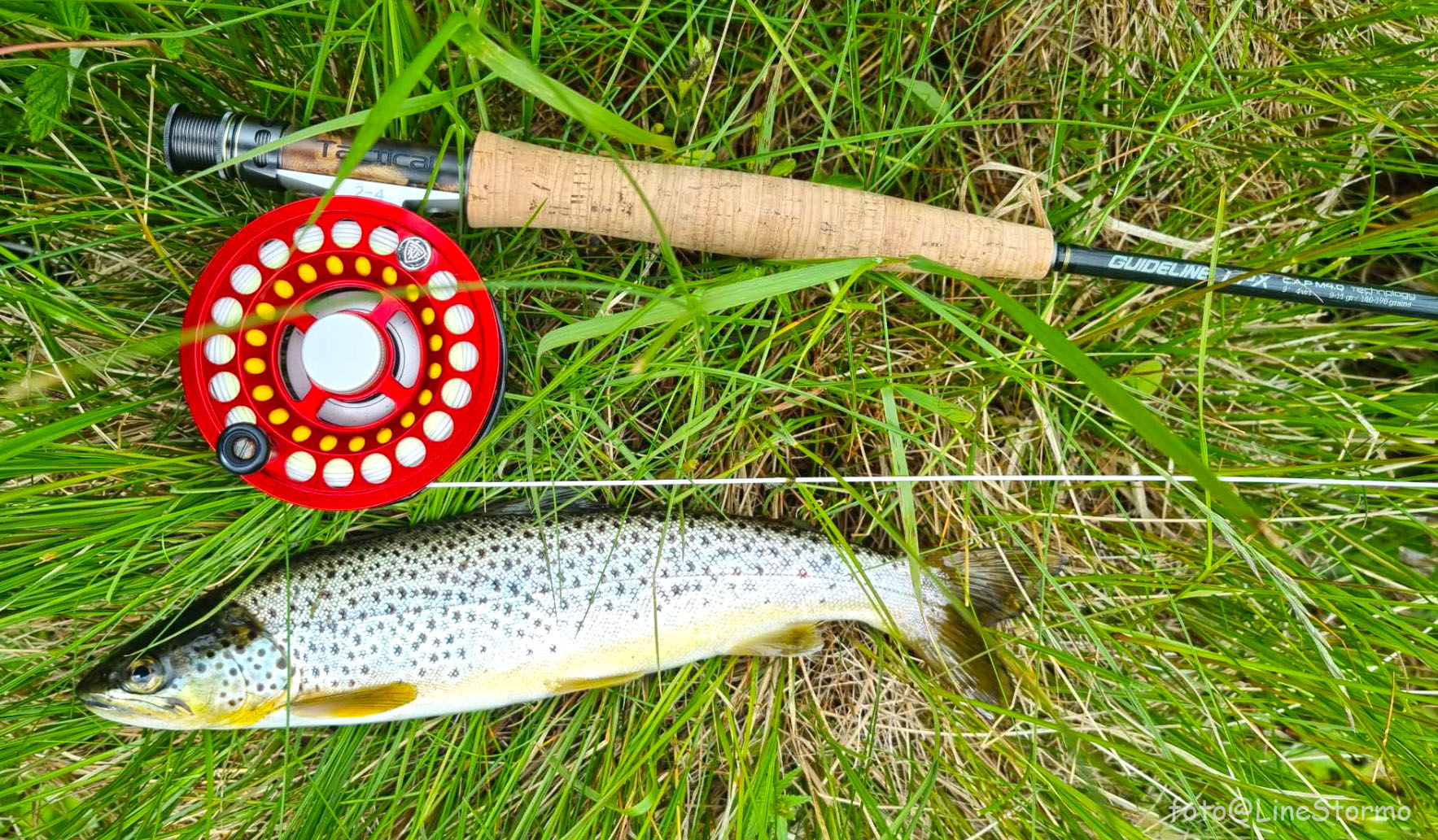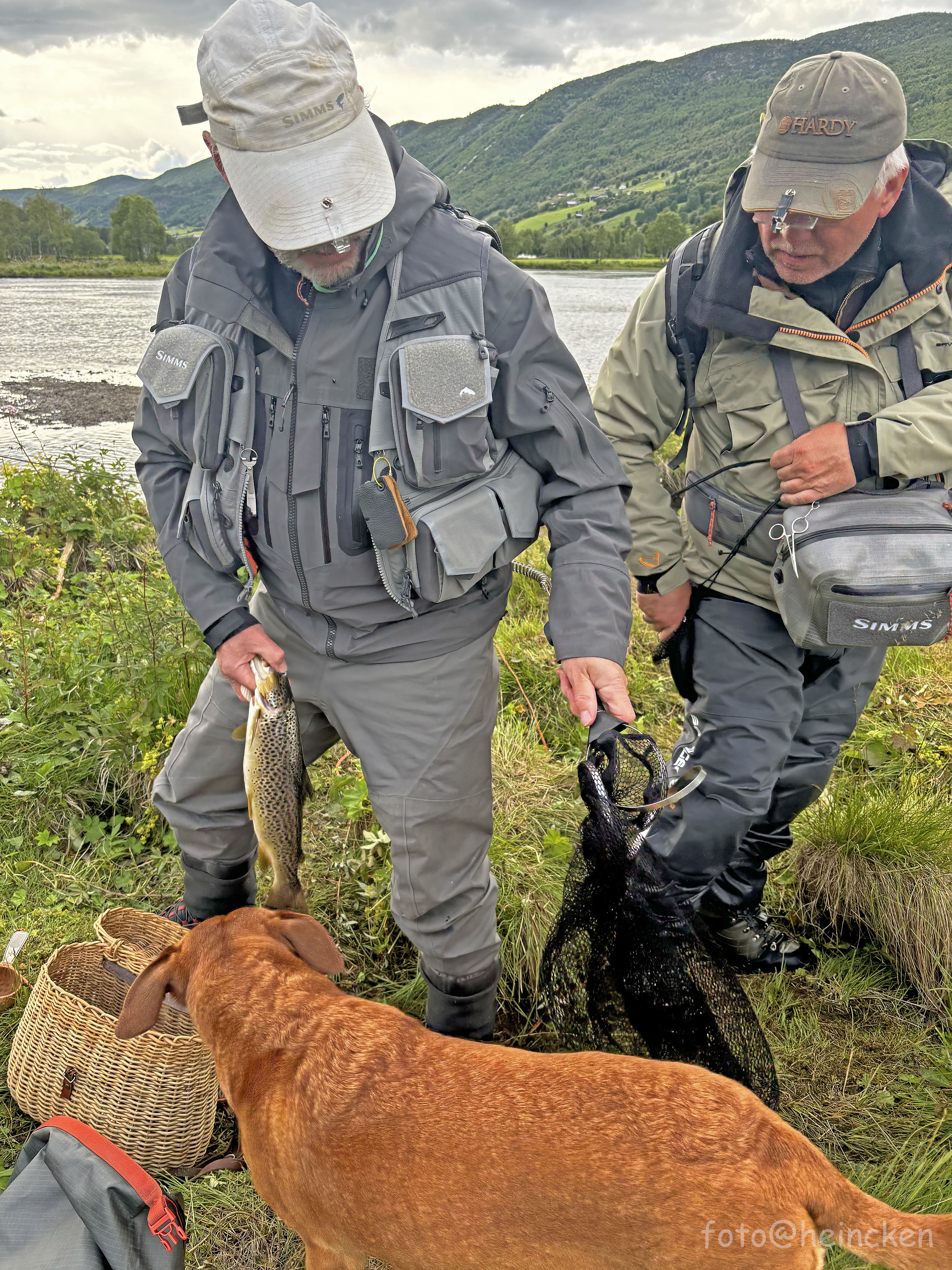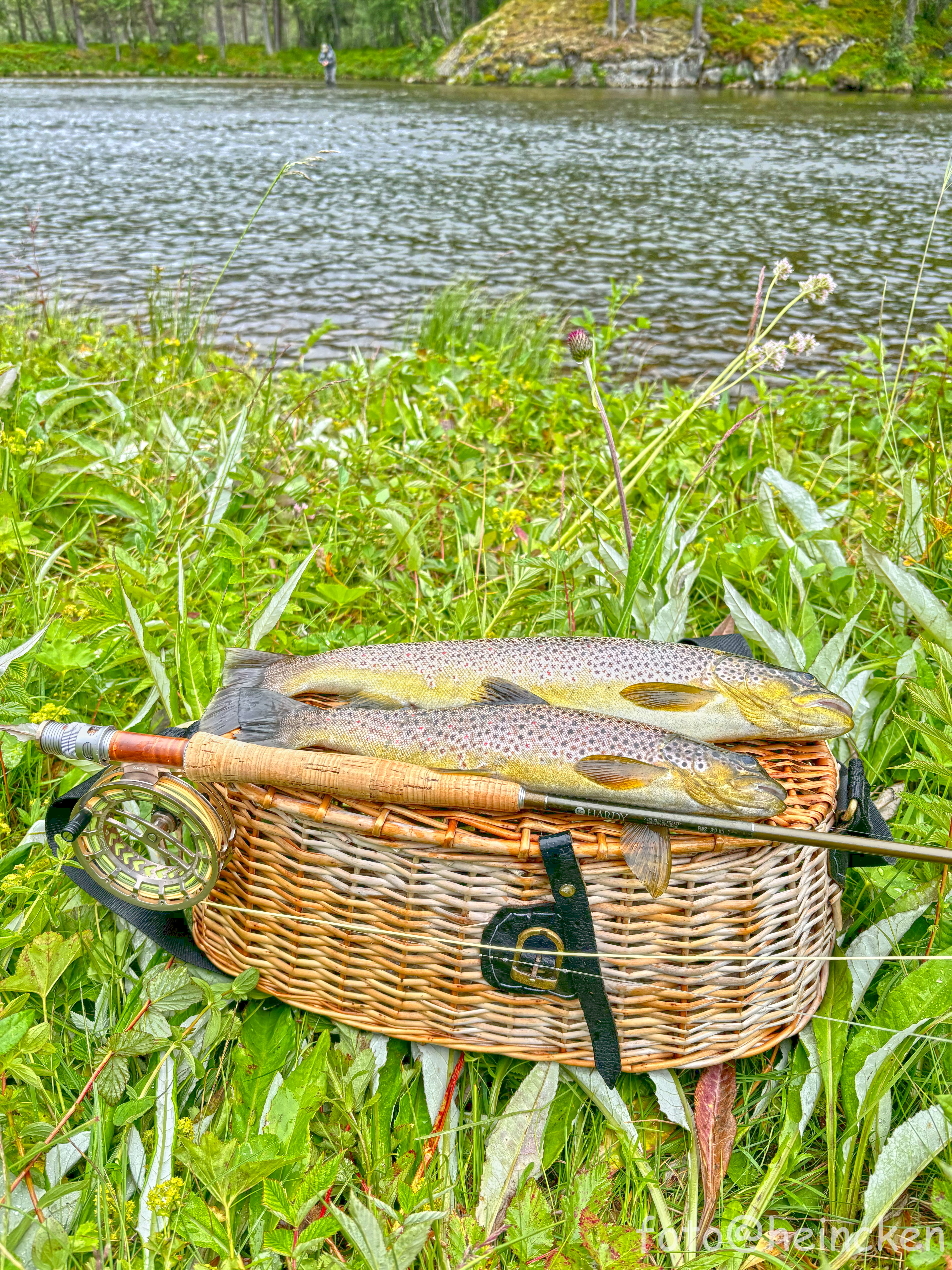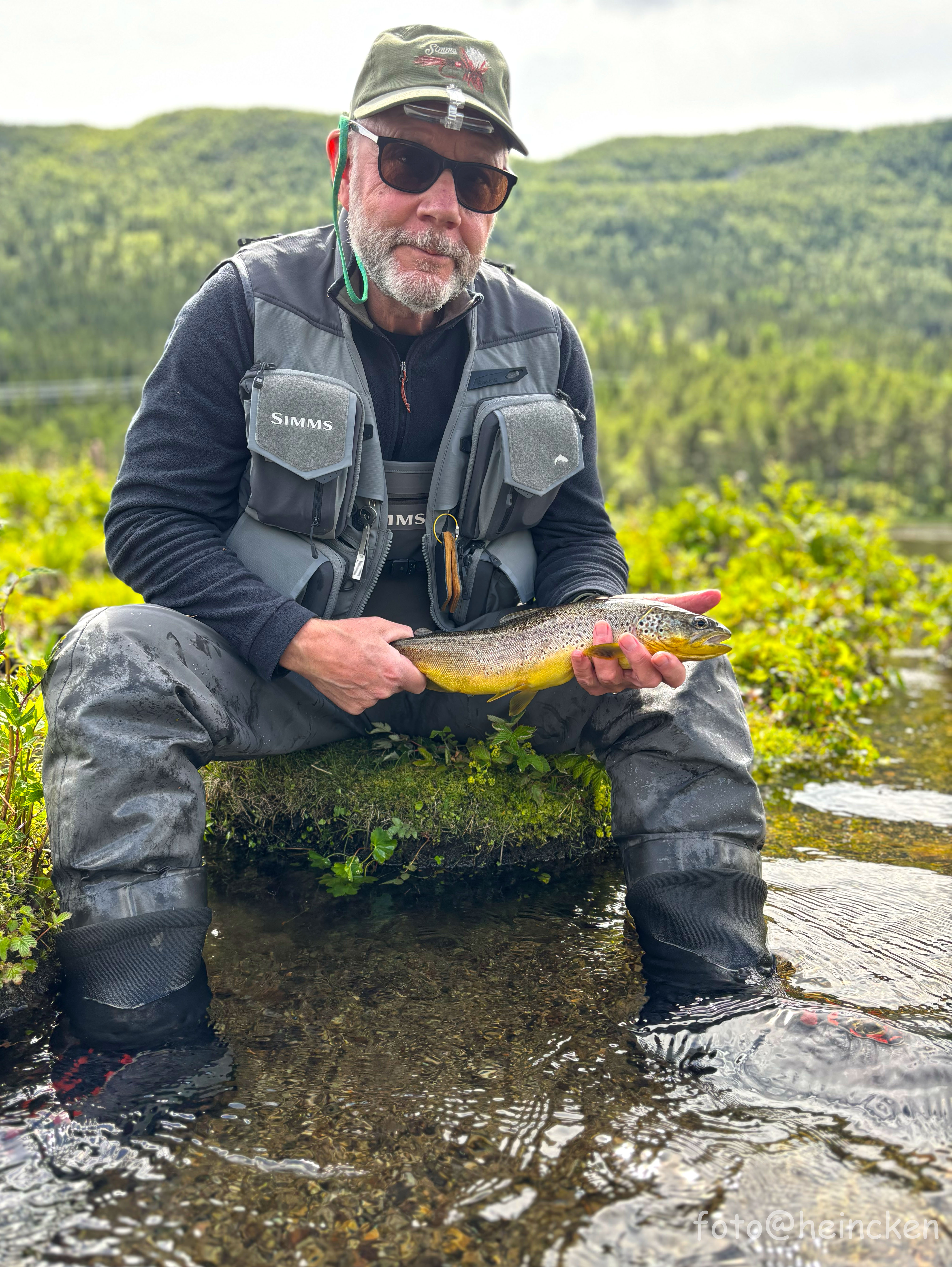Etter å ha lagt ut fluen noen meter over fisken som vaket, tok den og igjen satt tilslaget i vinden selv om kunststykket er å følge med på buktene på fluelinene som ofte går mye raskere enn selve fluen og spissen. Noen sekunder senere vaket nok en fisk like nedenfor og igjen var det valgene om vinkel, lengde, vindretning og klare å legge fluen akkurat der den må flyte for at fisken skal velge tørrfluen isteden for de absolutt perfekte døgnfluene som danset seg nedover i strømmene. Etter tredje kastet tok den fluen og jeg tenkte mitt mens Morten satt oppe i en fjellskrent under noen store grantrær, for å speide etter vakende fisk og Ragnar hadde sitt «Sjøørretfiske» lengre ute. Nok en vakker matfisk ble offer for en grotesk opplevelse av en barbarisk person som valte å avslutte dette livet for sitt eget ego🫣