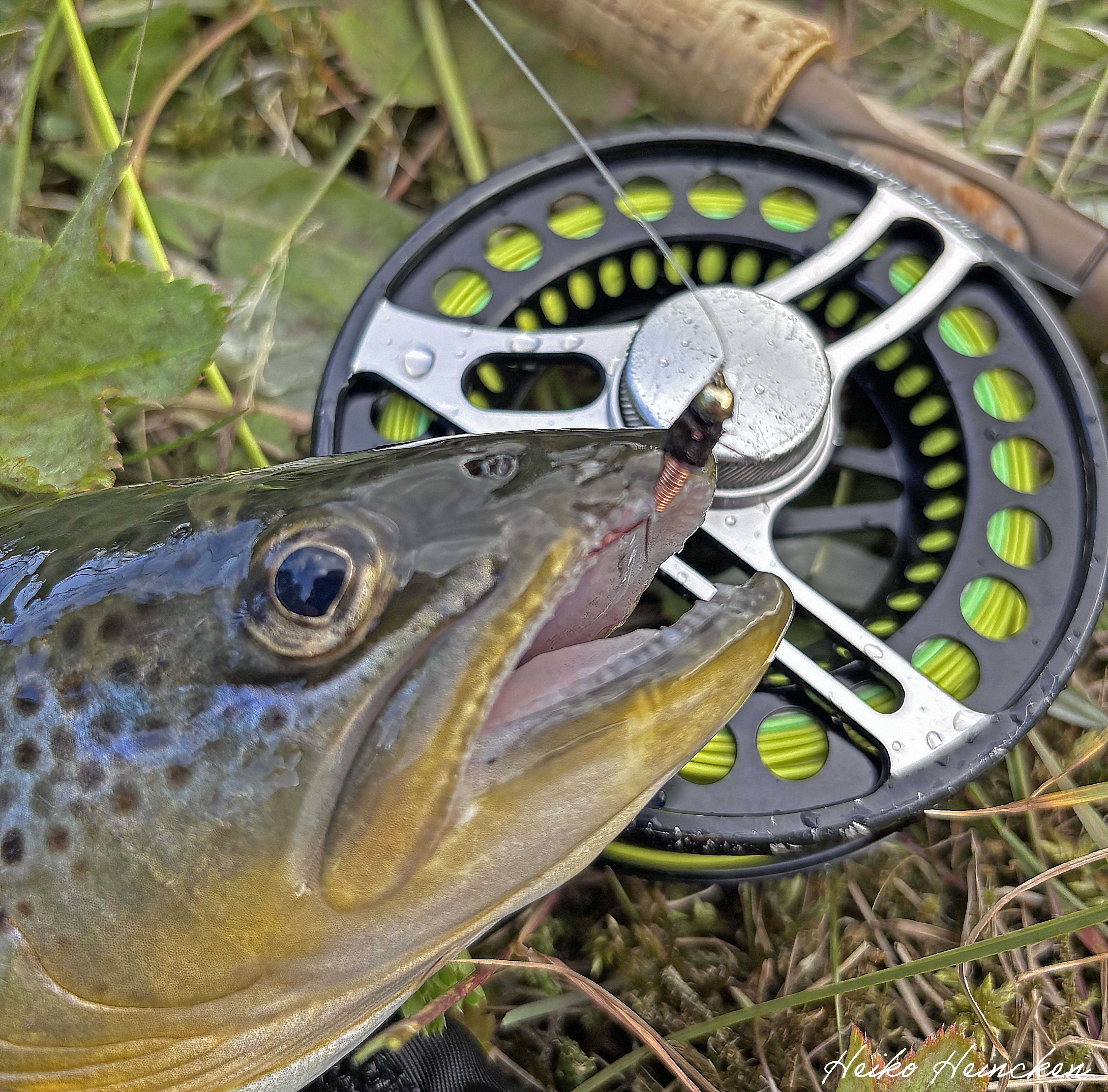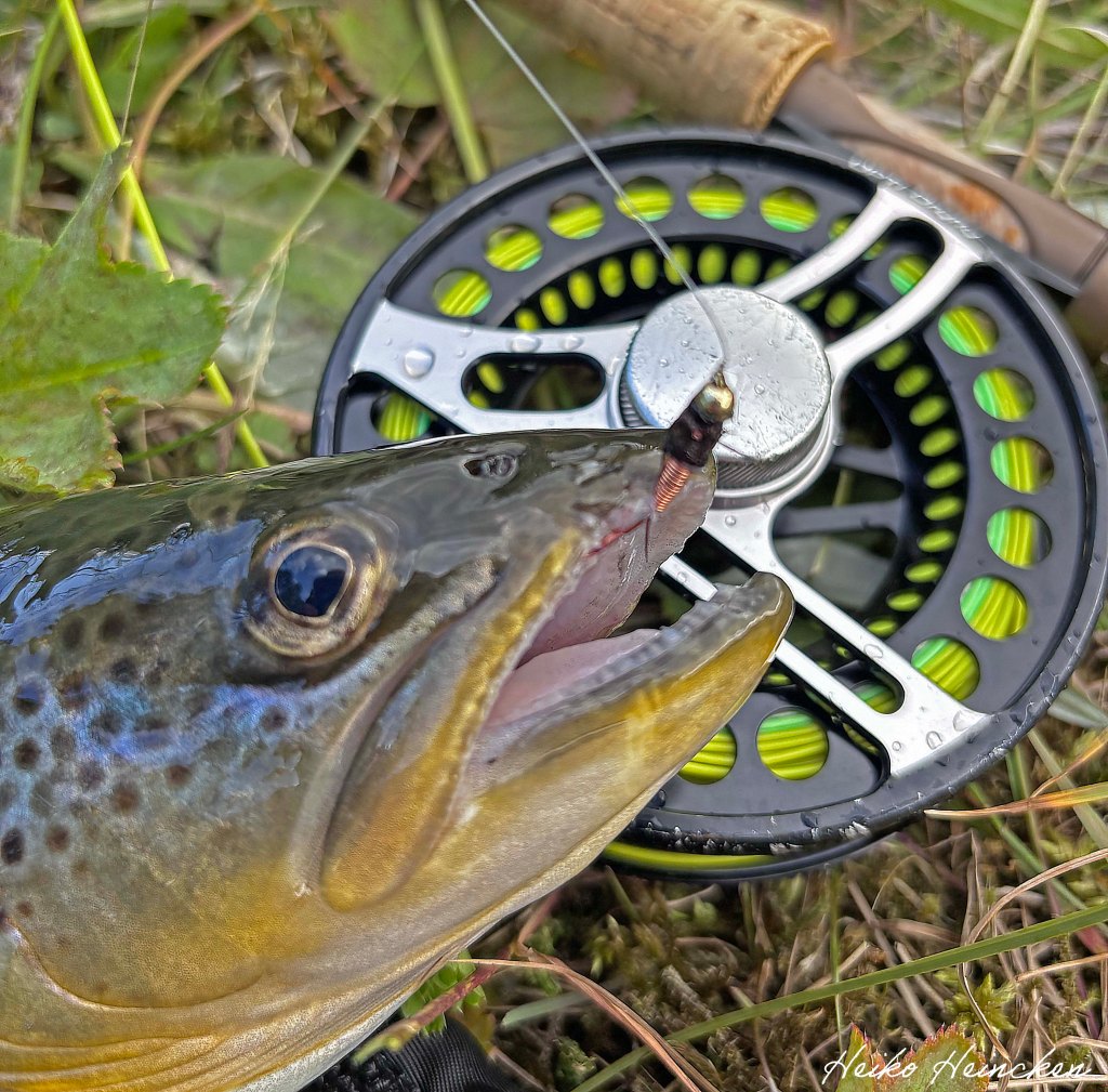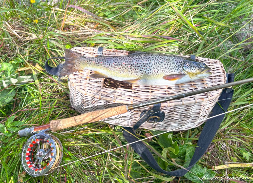 Men, så er det jo slik at: Den som gir seg, er en dritt, og akkurat det skjedde sånn ca 6 timer senere der jeg startet dagen med å luske meg rundt i graset på motsatt side og ligge bak ei bjørk for å kaste på en pen fisk som sto under godt beskyttet å vaket konstant. Ikke faan å få den til å ta, og da jeg i tillegg plasserte hele fordømte fortom og spiss opp i en av grenene, ble det komplett og hele driten røyk! Da jeg omsider fikk på nytt og skulle til å legge ut, så kroket jeg hele fordømte gress åkeren bak meg! Temperaturen steg og jeg røsket i snøret, men det satt jo, så da brant jeg lillefingeren skikkelig i fluelina noe som avsluttet denne fisken føre lunsj, som selvsagt fortsatte å vake steady ….. men som sagt, den som gir seg er en dritt og det skulle ta 6 timer før jeg klarte å lure denne vakre skapningen som fikk livet tilbake som takk for en real god oppvisning i å irritere oss fluefiskere!